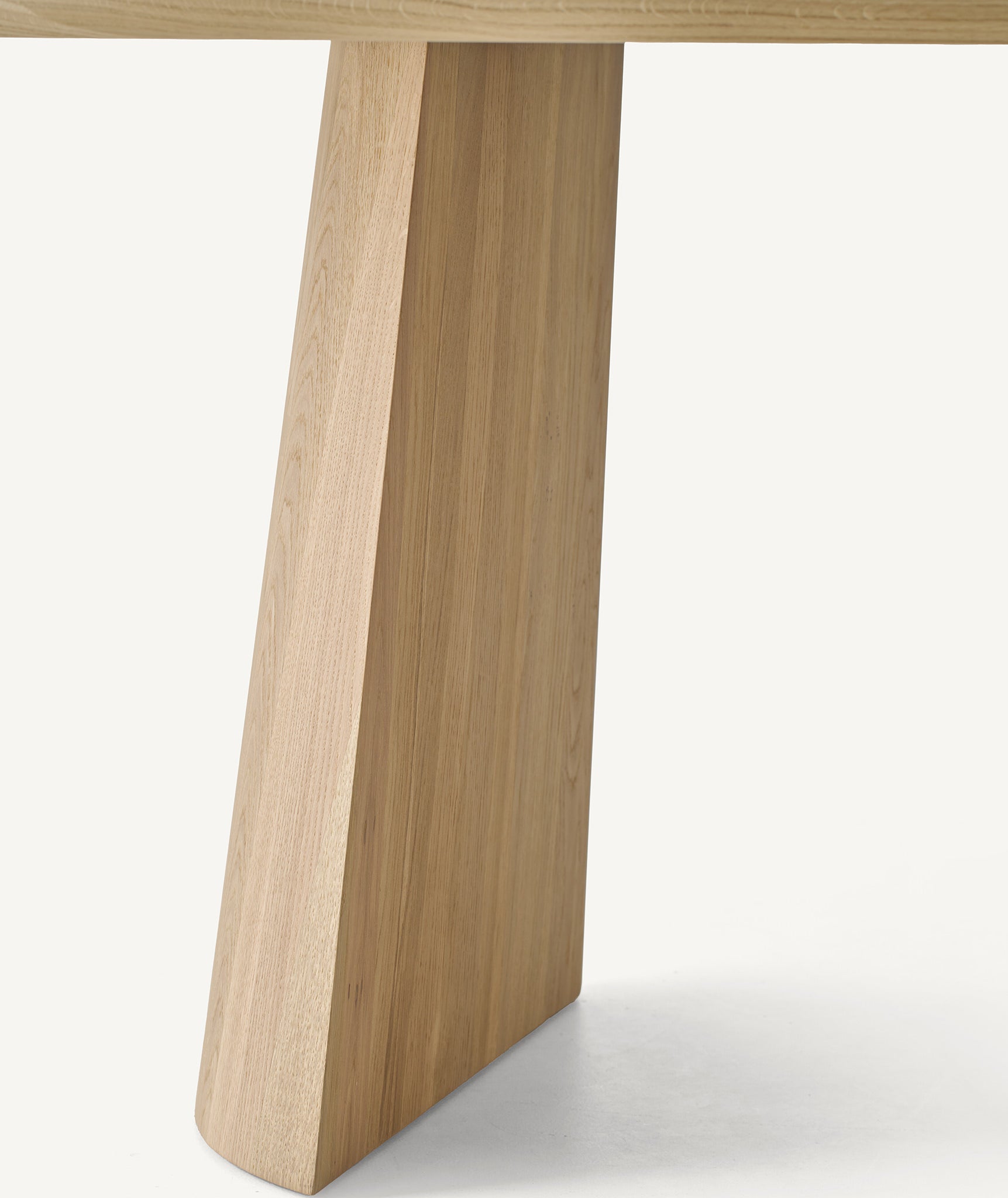 The top of each table is also solid wood, not veneer; a radius edged 3.2 cm on the dining tables, 5 cm with a sculpted lip edge on the occasional tables. Each object looks firmly grounded and commands attention but is refined too, a balance of presence with lightness.