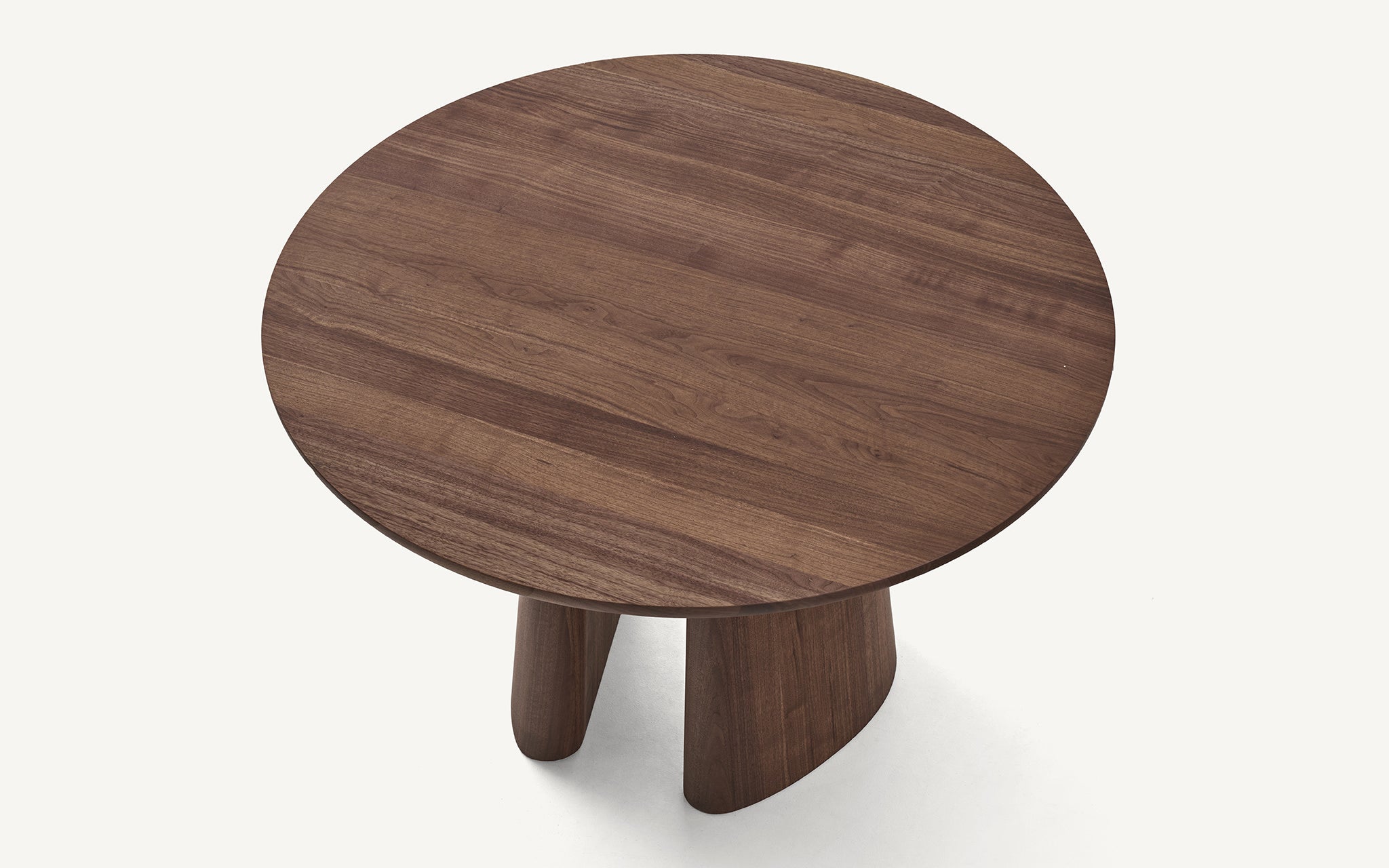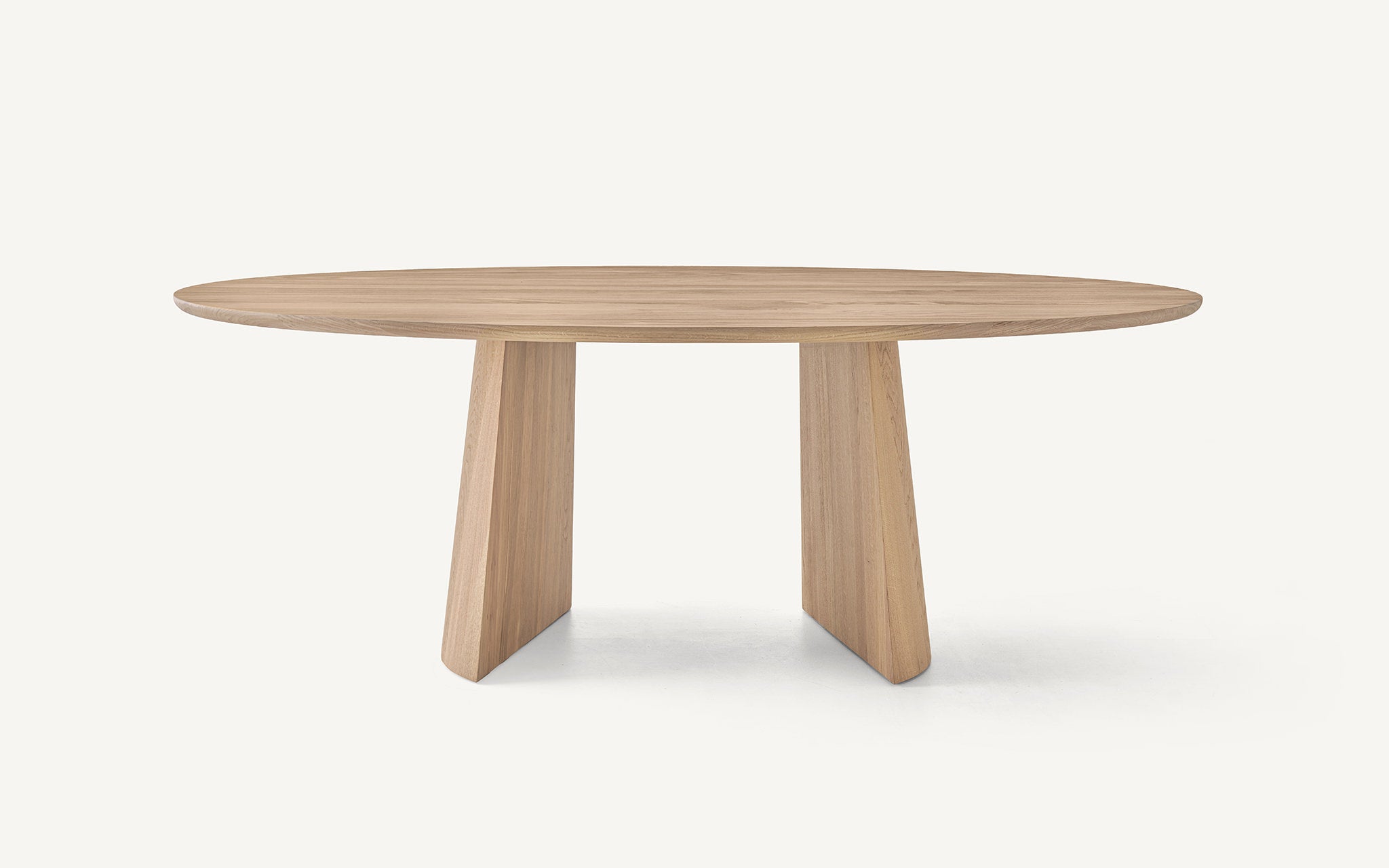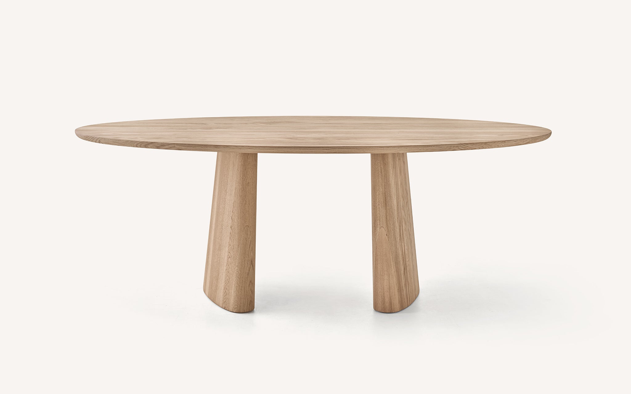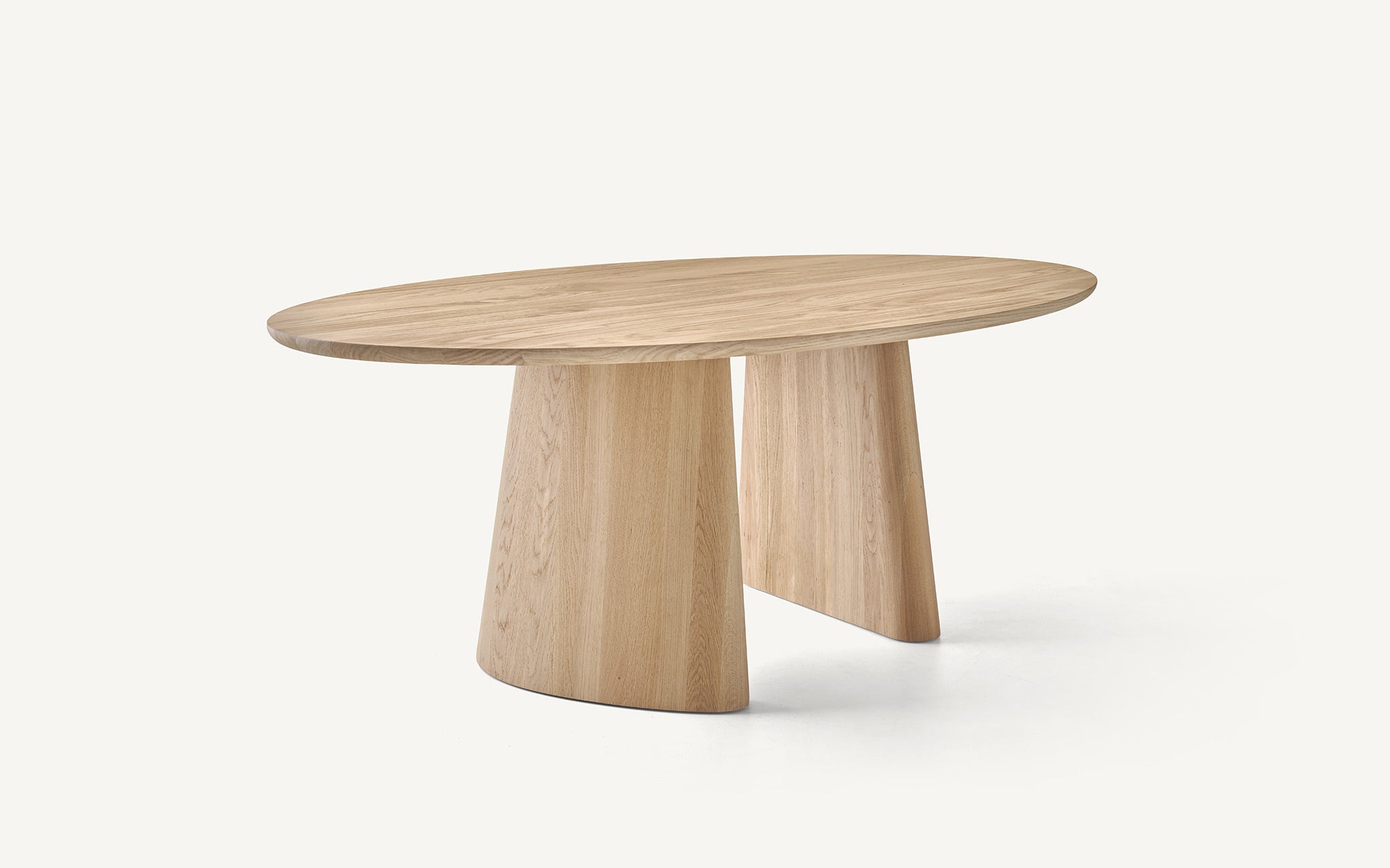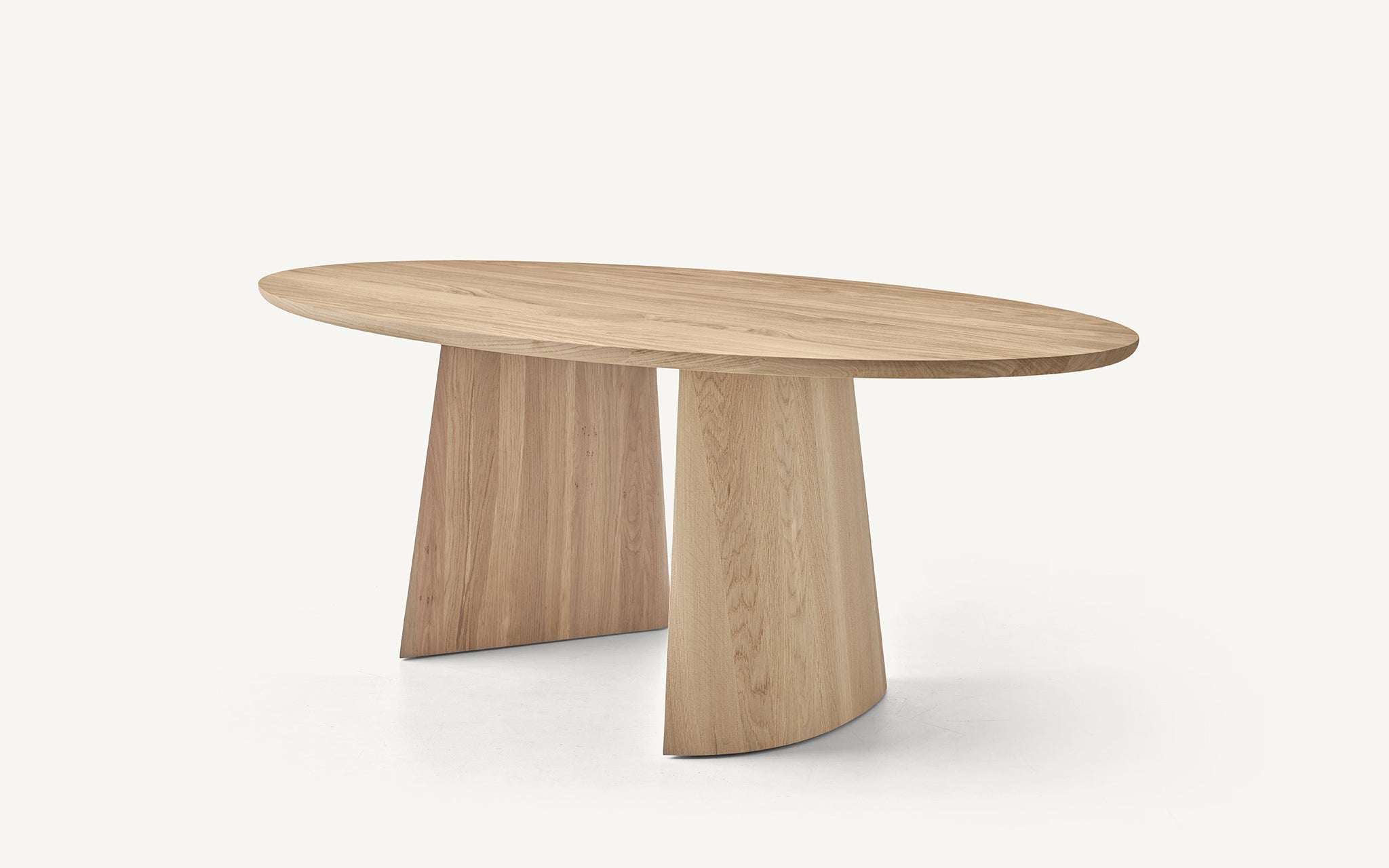 The tables are designed to have an efficient shape with a bold expression and sculptural form, carved from solid wood. The base of each table has a smooth, elliptical visual style. The incline of the surface of solid wood – broader at the base, sculpted and tapered towards the top – speaks of strength and stability. Larger tables are comprised of two smooth forms that sit apart with negative space between the supporting elements. Smaller tables are comprised of a single pedestal with an artfully sliced-through core.