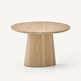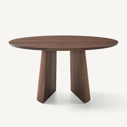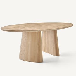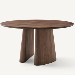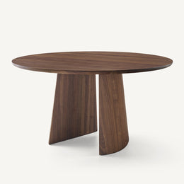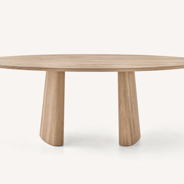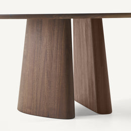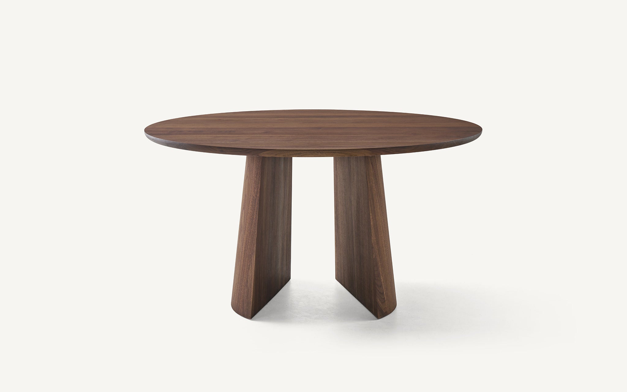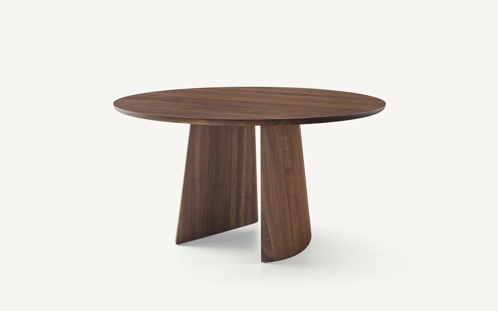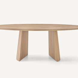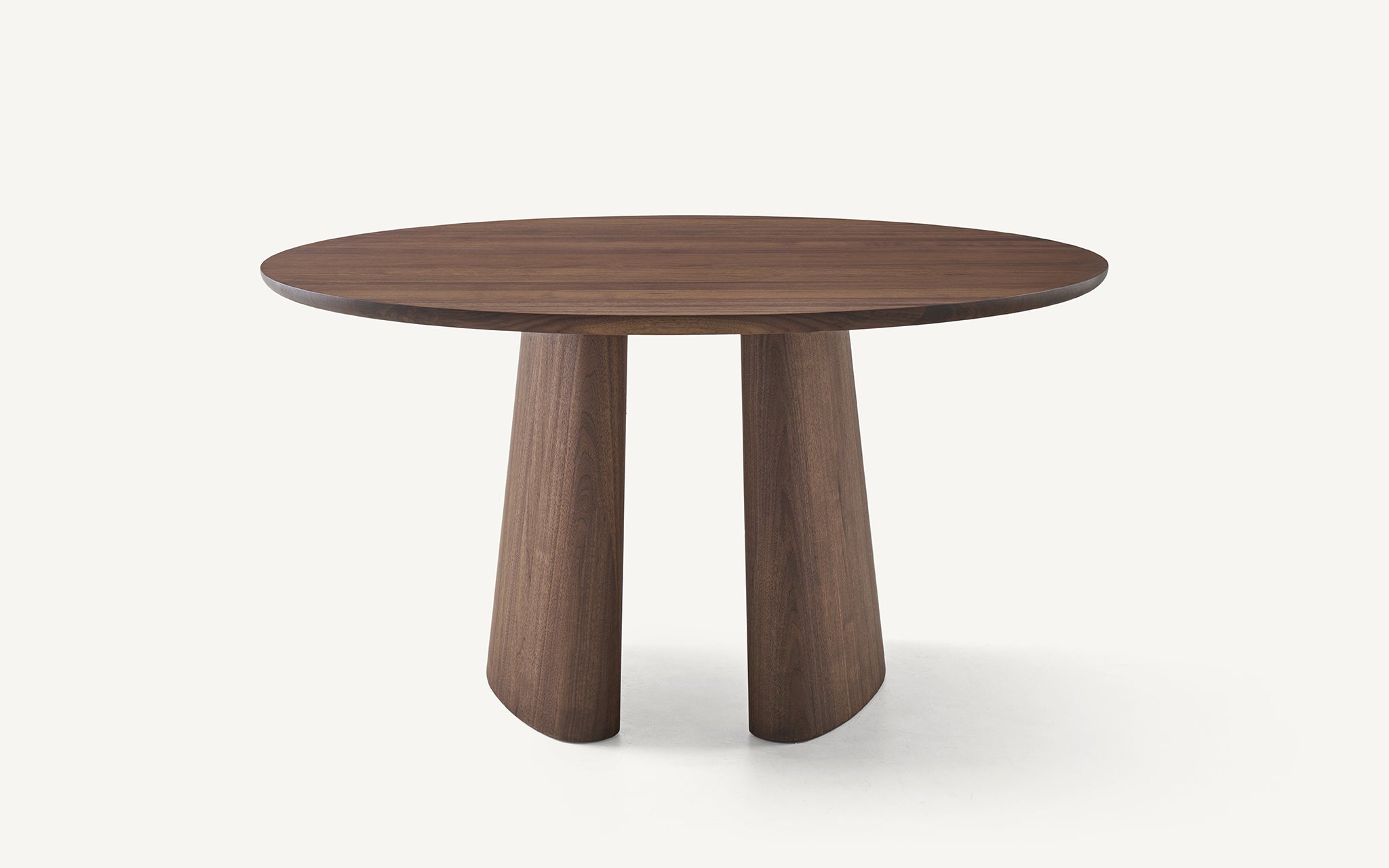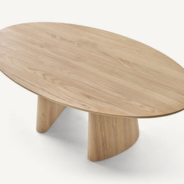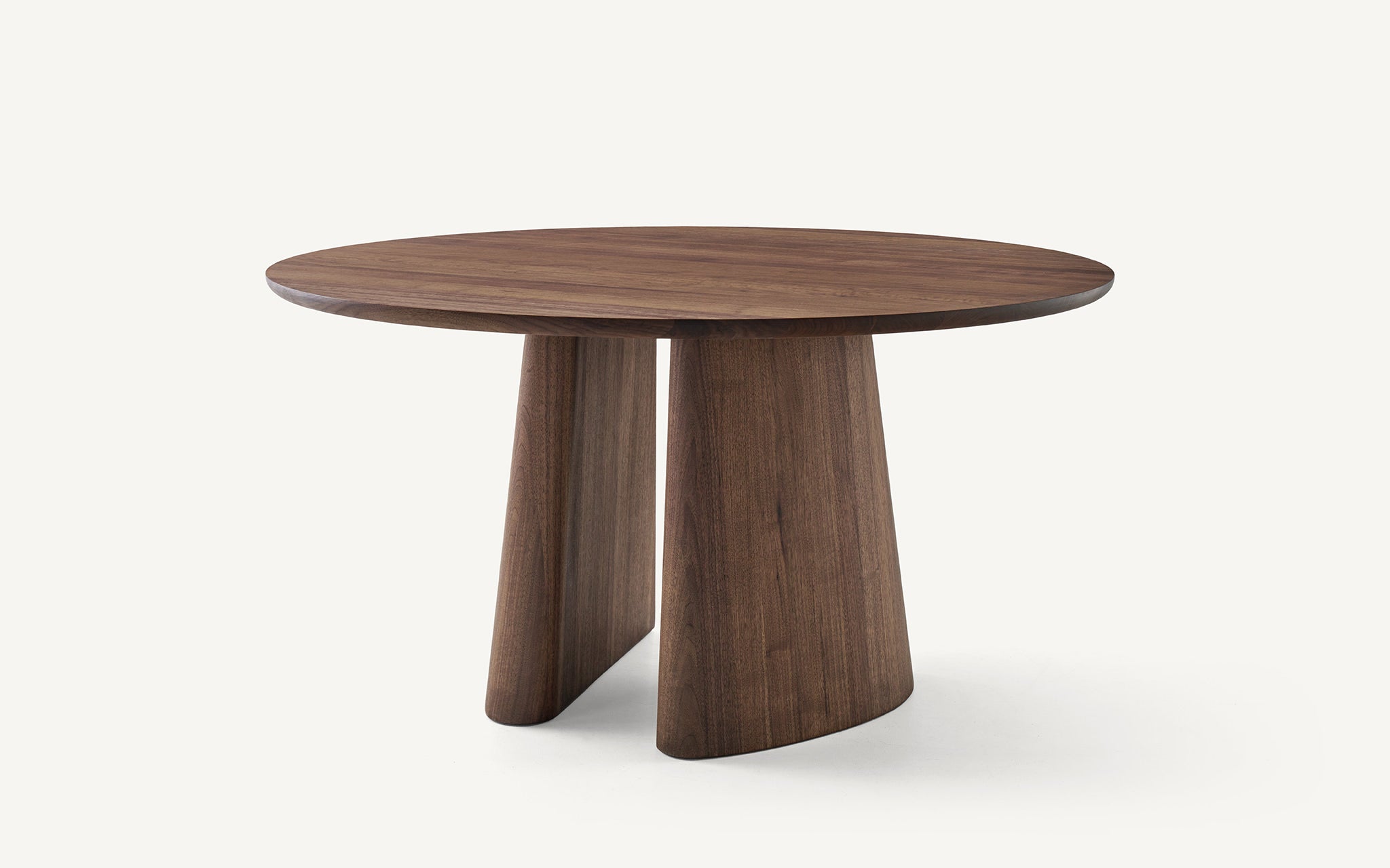 The tables are designed to have an efficient shape with a bold expression and sculptural form, carved from solid wood. The base of each table has a smooth, elliptical visual style. The incline of the surface of solid wood – broader at the base, sculpted and tapered towards the top – speaks of strength and stability. Larger tables are comprised of two smooth forms that sit apart with negative space between the supporting elements. Smaller tables are comprised of a single pedestal with an artfully sliced-through core.