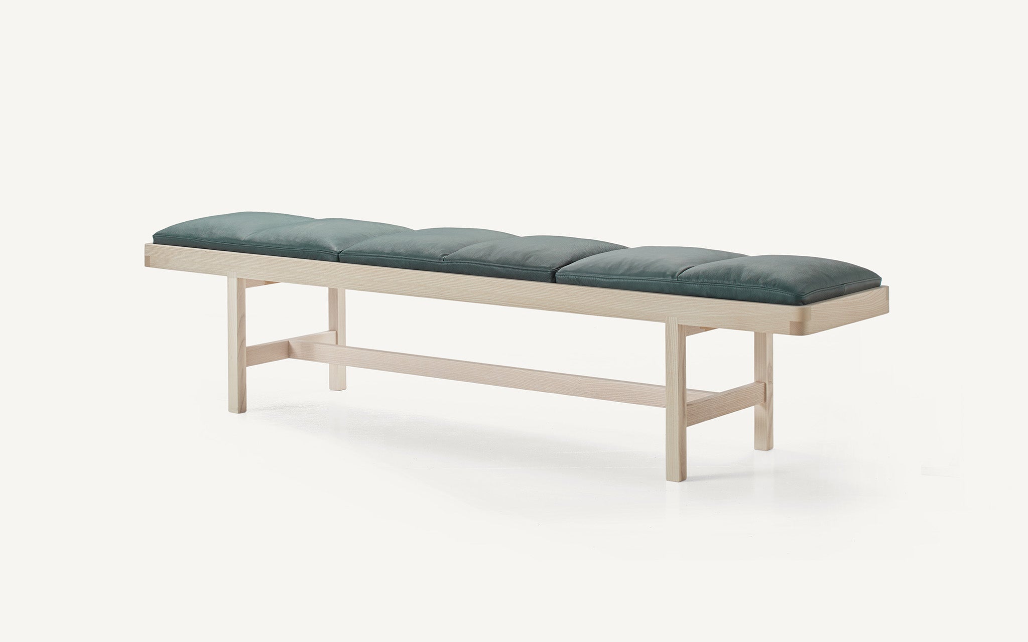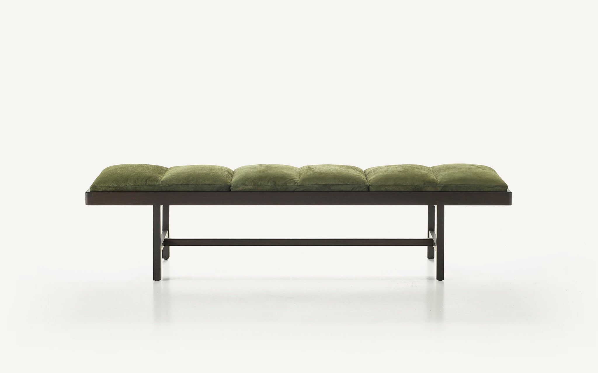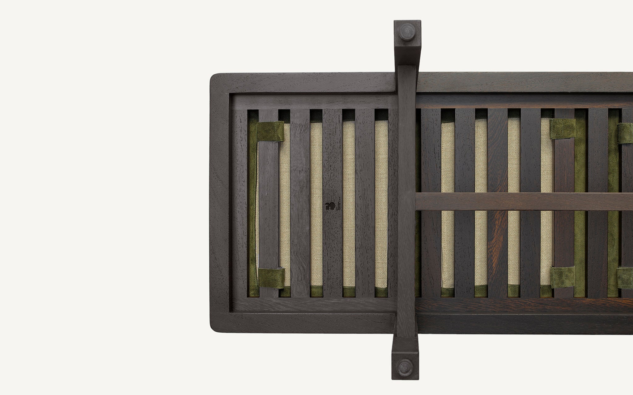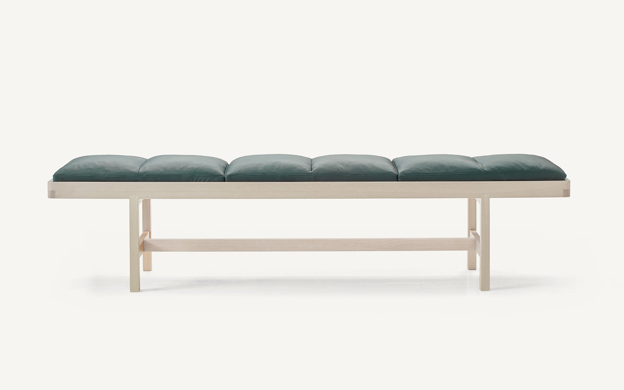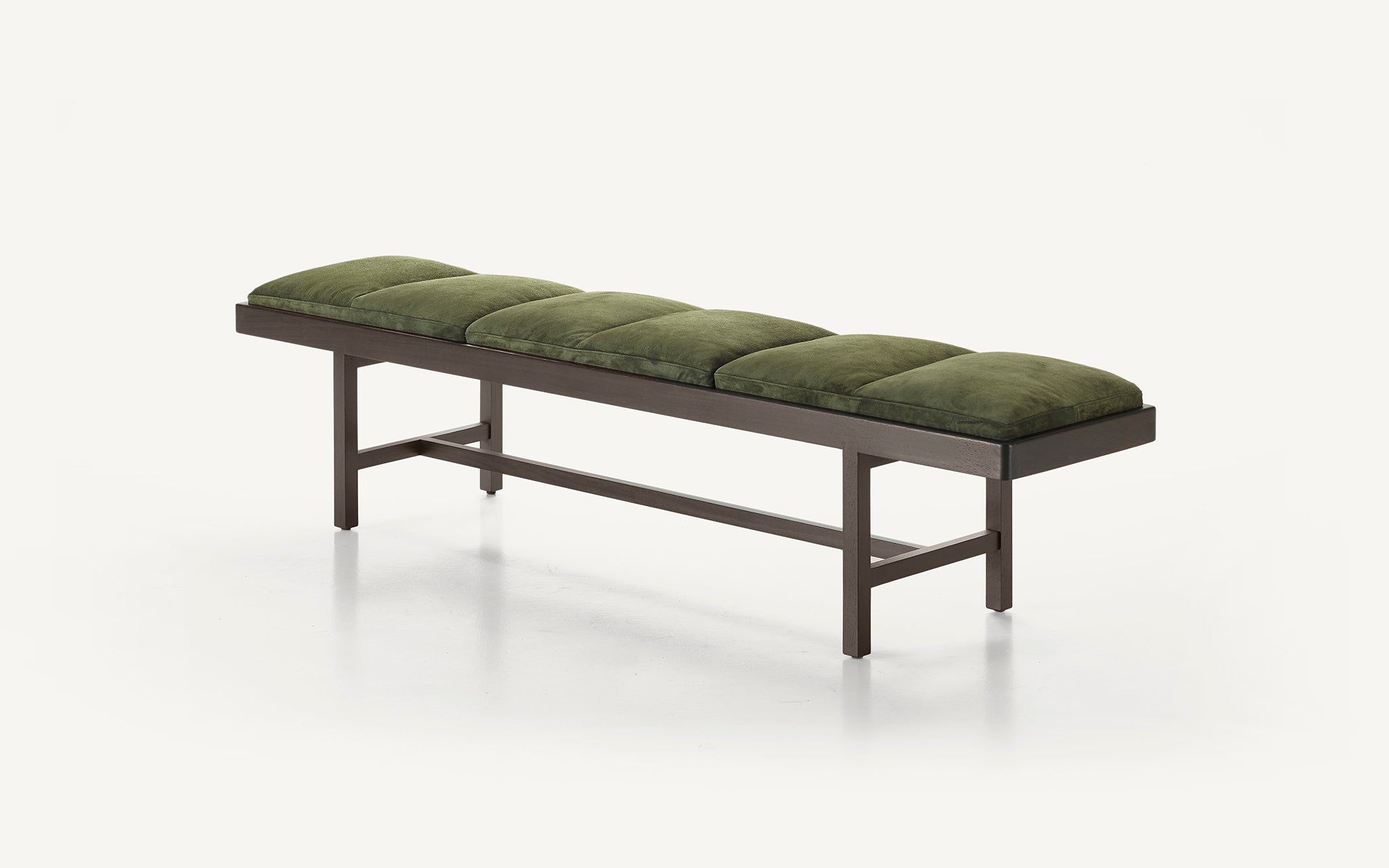 Each cushion is hand-sewn from four panels, padded with all-natural down filling for softness, and edge-banded foam for sharpness. In the Daybed design, a separate headrest cushion is detachable, and an oxidized brass back support mechanism adjusts to three different positions. The Daybench Collection includes several options – height-adjusted for different uses, both dining and lounge, and shorter and elongated versions. Each design from the Collection is visually compelling when paired with other furniture – a sturdy but elegant antidote to the uniform landscape of lounge chairs and sofas.
