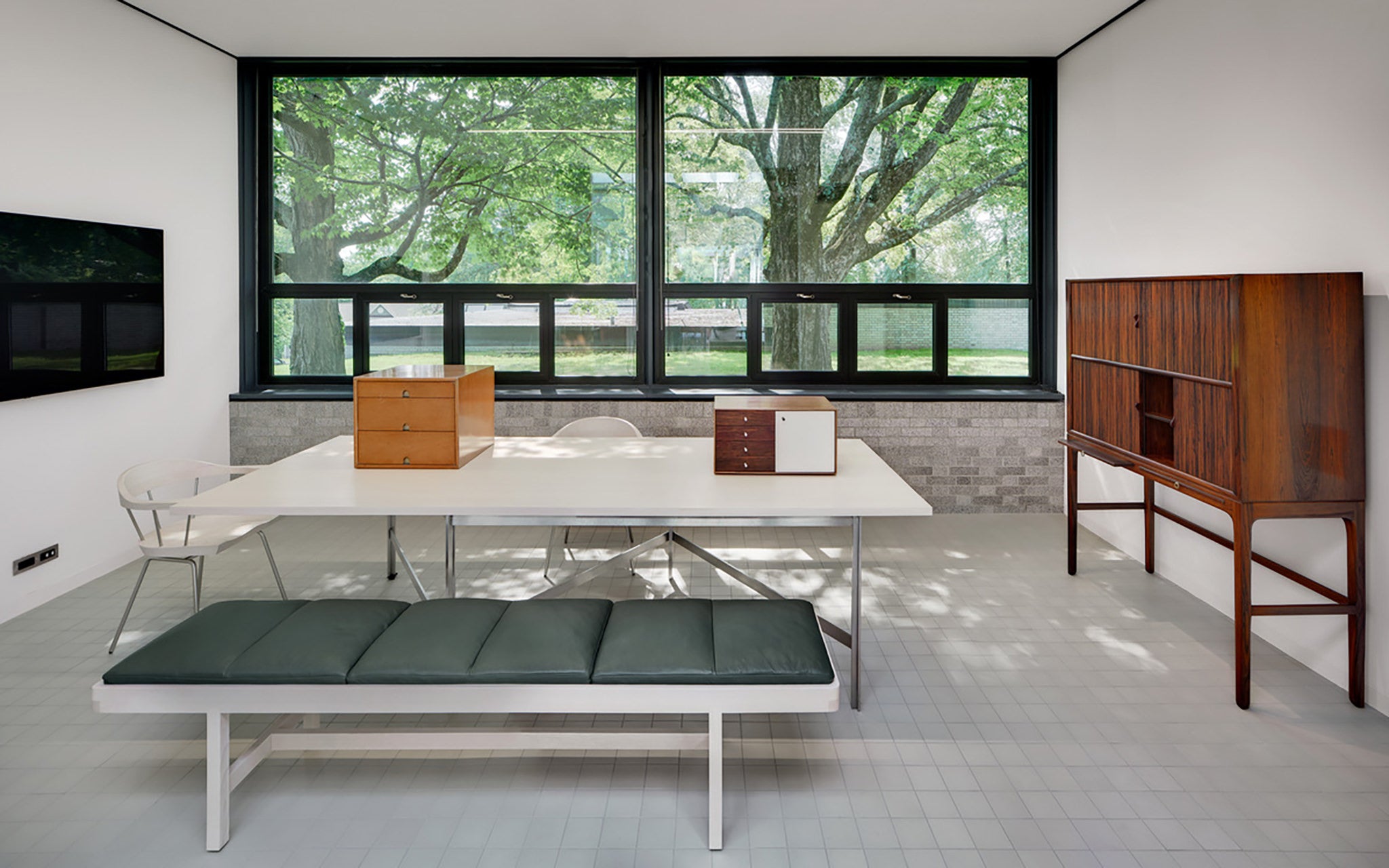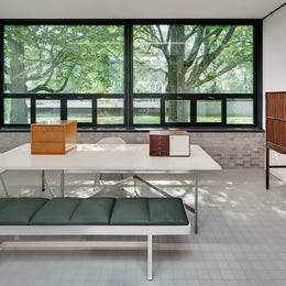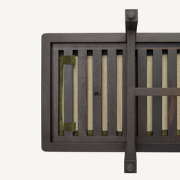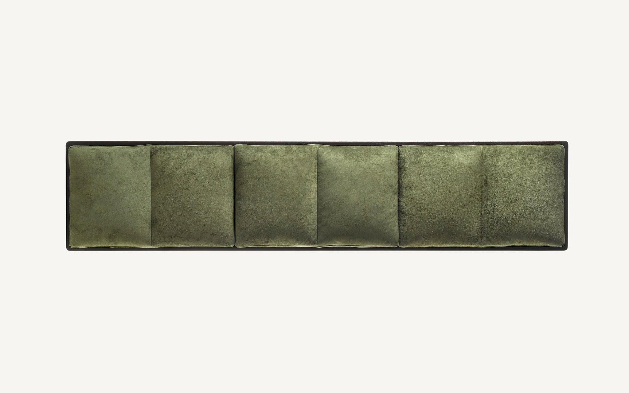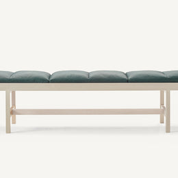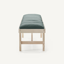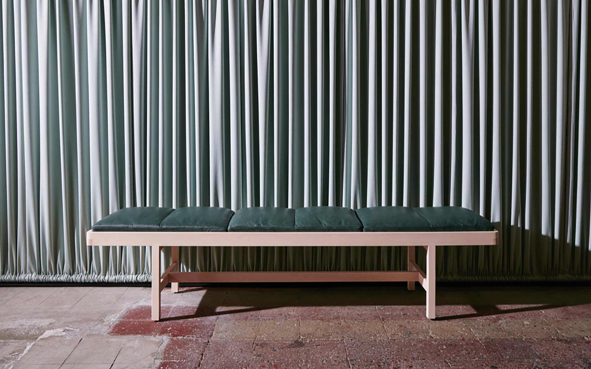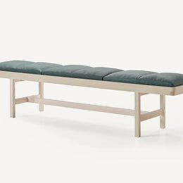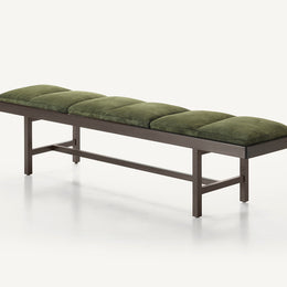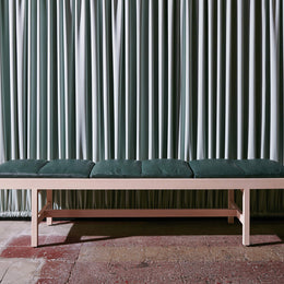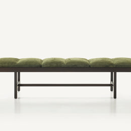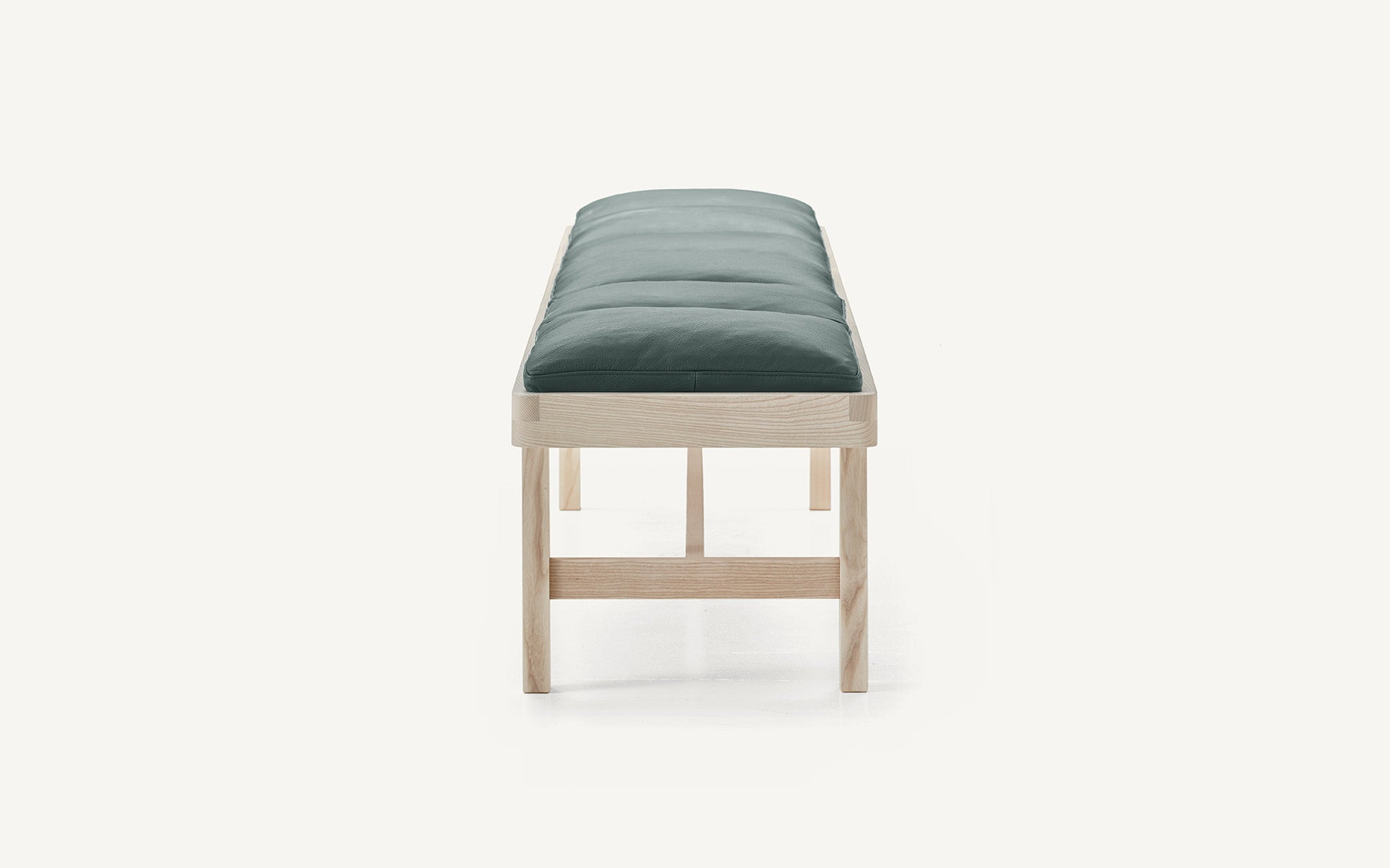 Each cushion is hand-sewn from four panels, padded with all-natural down filling for softness, and edge-banded foam for sharpness. In the Daybed design, a separate headrest cushion is detachable, and an oxidized brass back support mechanism adjusts to three different positions. The Daybench Collection includes several options – height-adjusted for different uses, both dining and lounge, and shorter and elongated versions. Each design from the Collection is visually compelling when paired with other furniture – a sturdy but elegant antidote to the uniform landscape of lounge chairs and sofas.