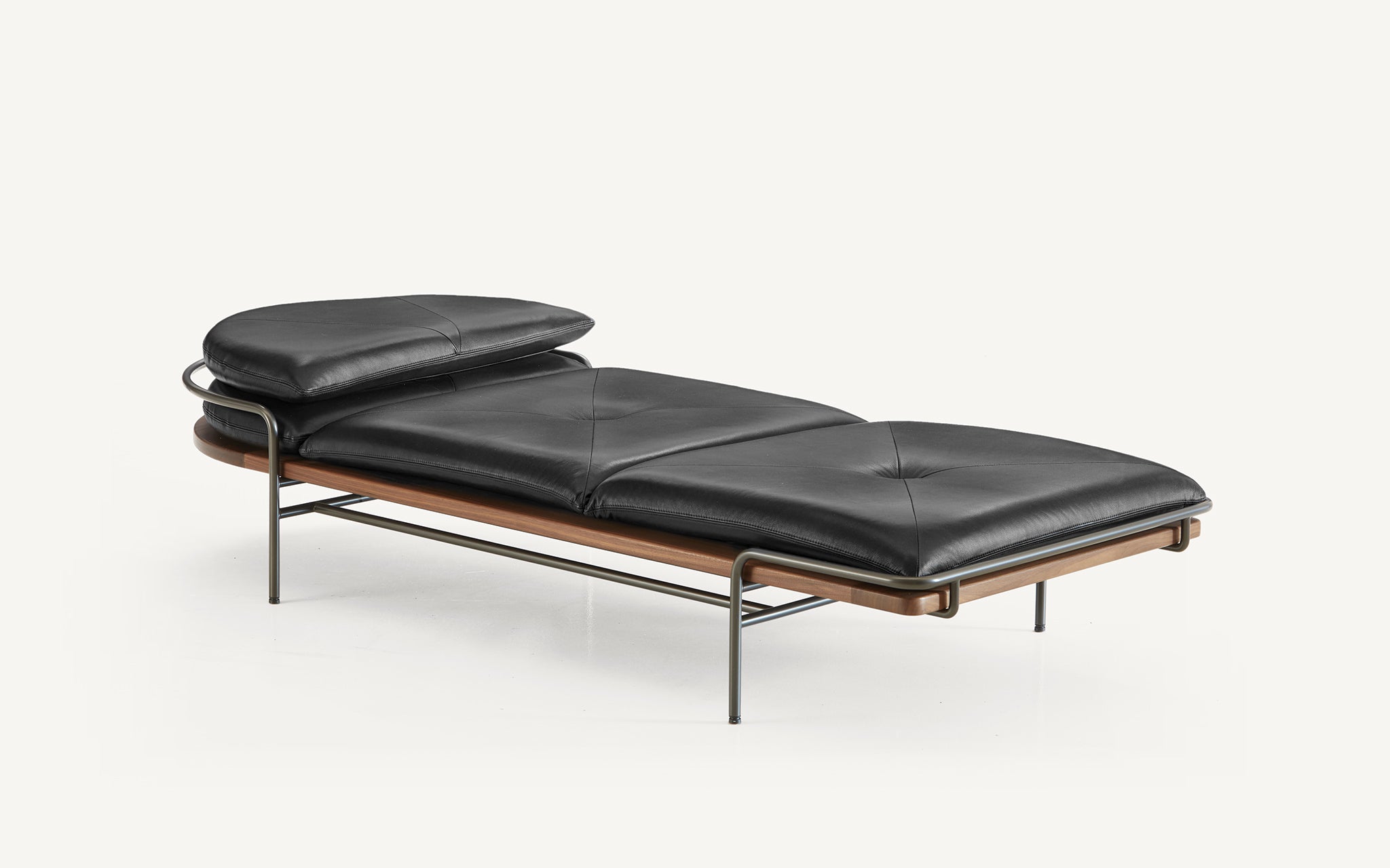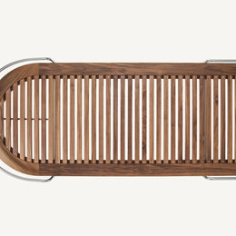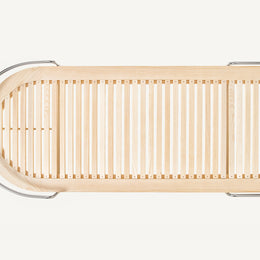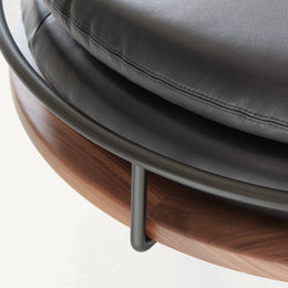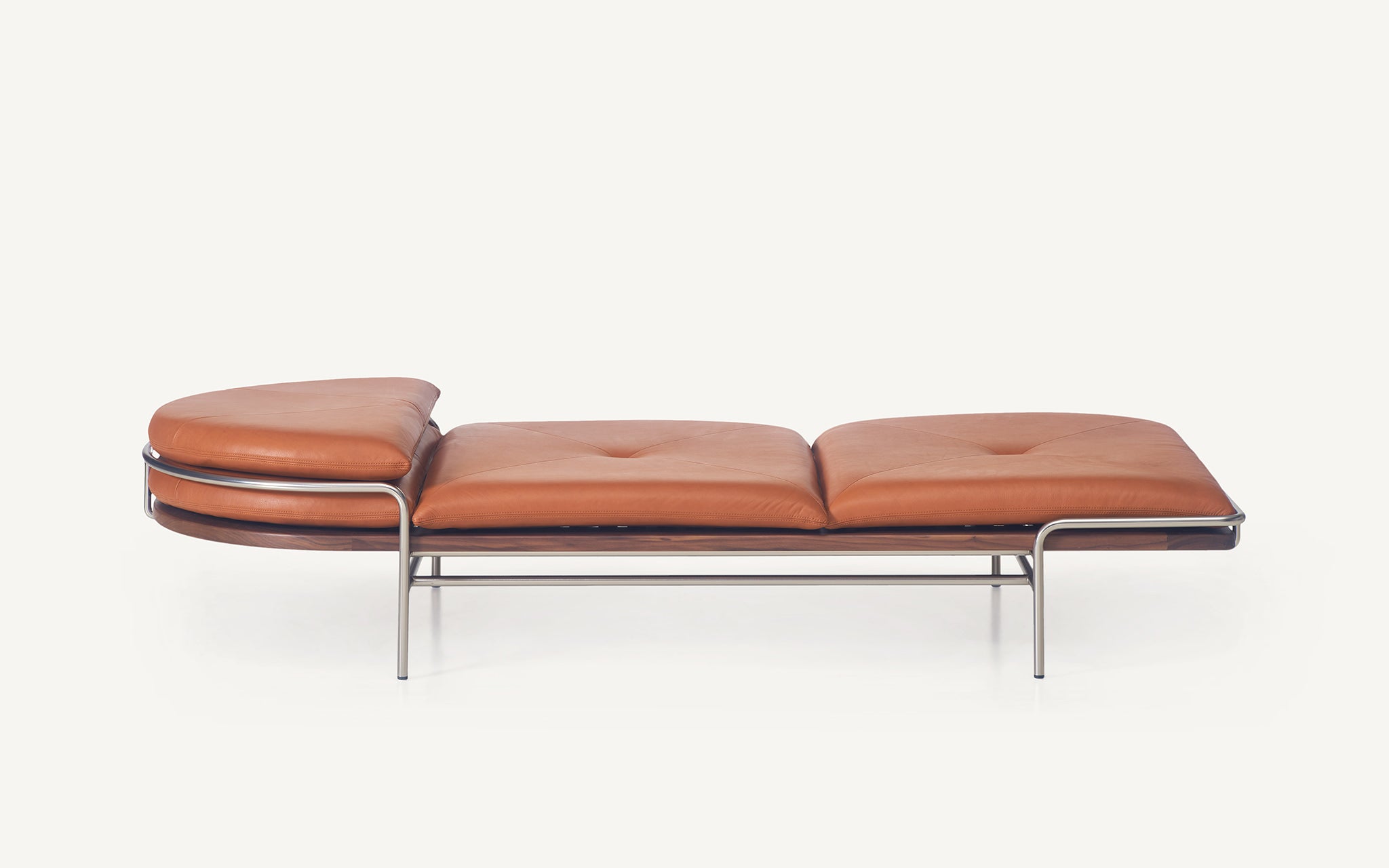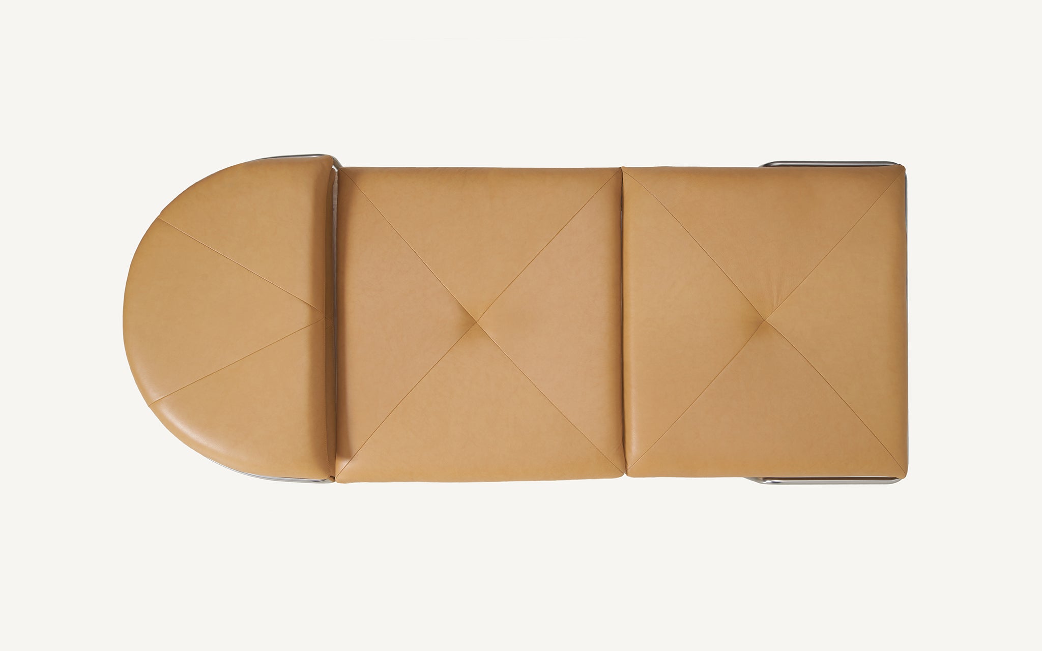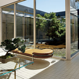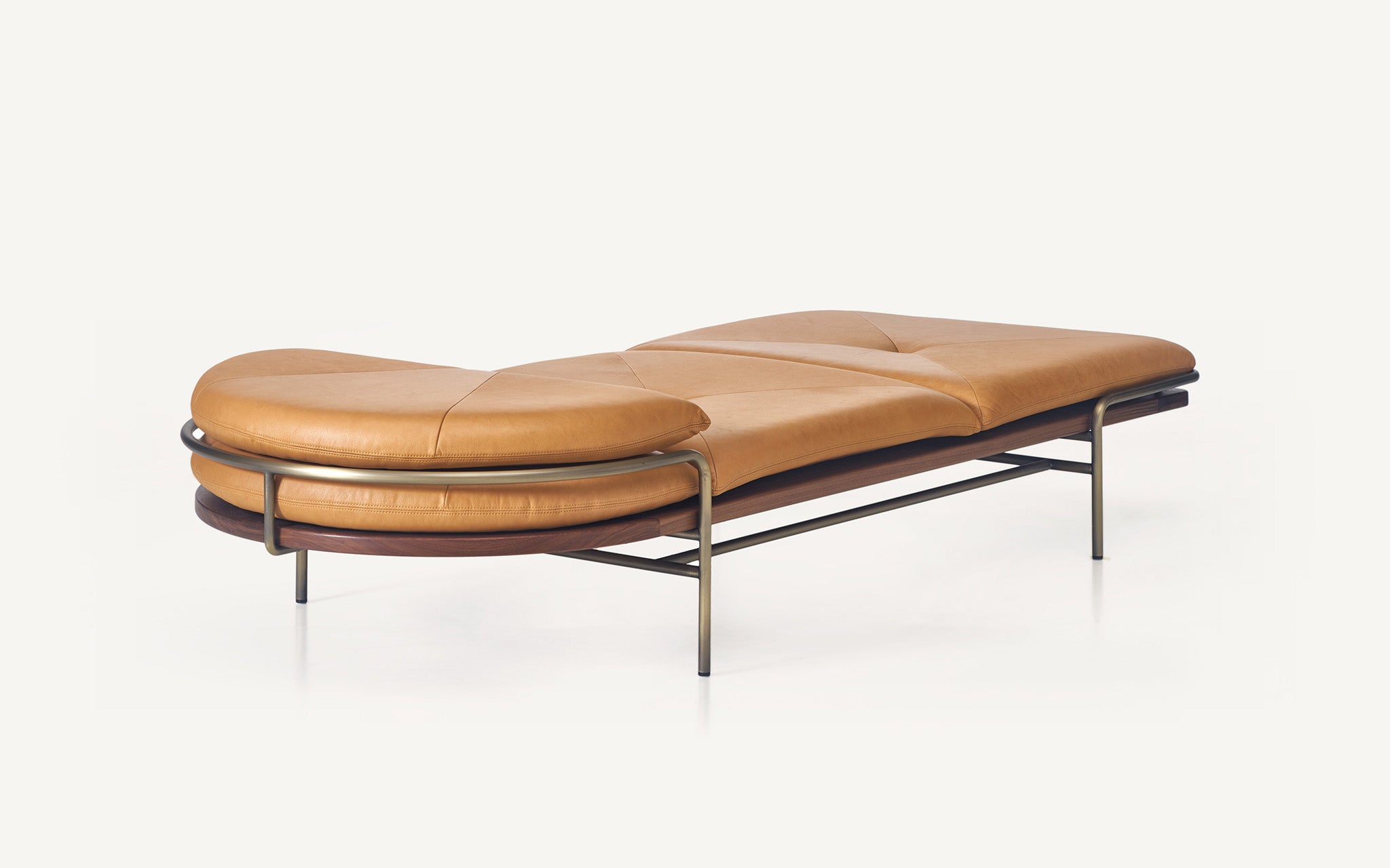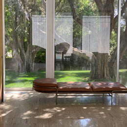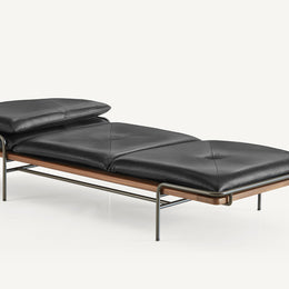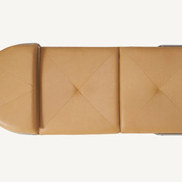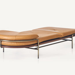 These designs are a celebration of the pure geometry championed by the Wiener Werkstätte and Bauhaus. Simple, graphic, tubular steel creates a set of silhouettes in an unbroken line, suspending the softest of leather upholstered seating panels, backs, and wooden tabletops. Our Geometric Side Chair, Geometric Lounge Chair and Geometric Sofa feature an ergonomically shaped seat carved from solid wood, and a lightweight pellicle skin of Vienna caning. The tubular steel is wrapped with natural leather to conceal all joins and seams. The Geometric Dining Table with a veneer top and solid wood edges is defined by flamboyantly radiating support elements that meet at a central point, wrapped in leather. The Geometric Daybed has a solid wood frame with pegged slats engineered to allow for variable flex, its tubular steel base creating a continuous arc that holds leather cushions made of dual-density foam for comfort and support.