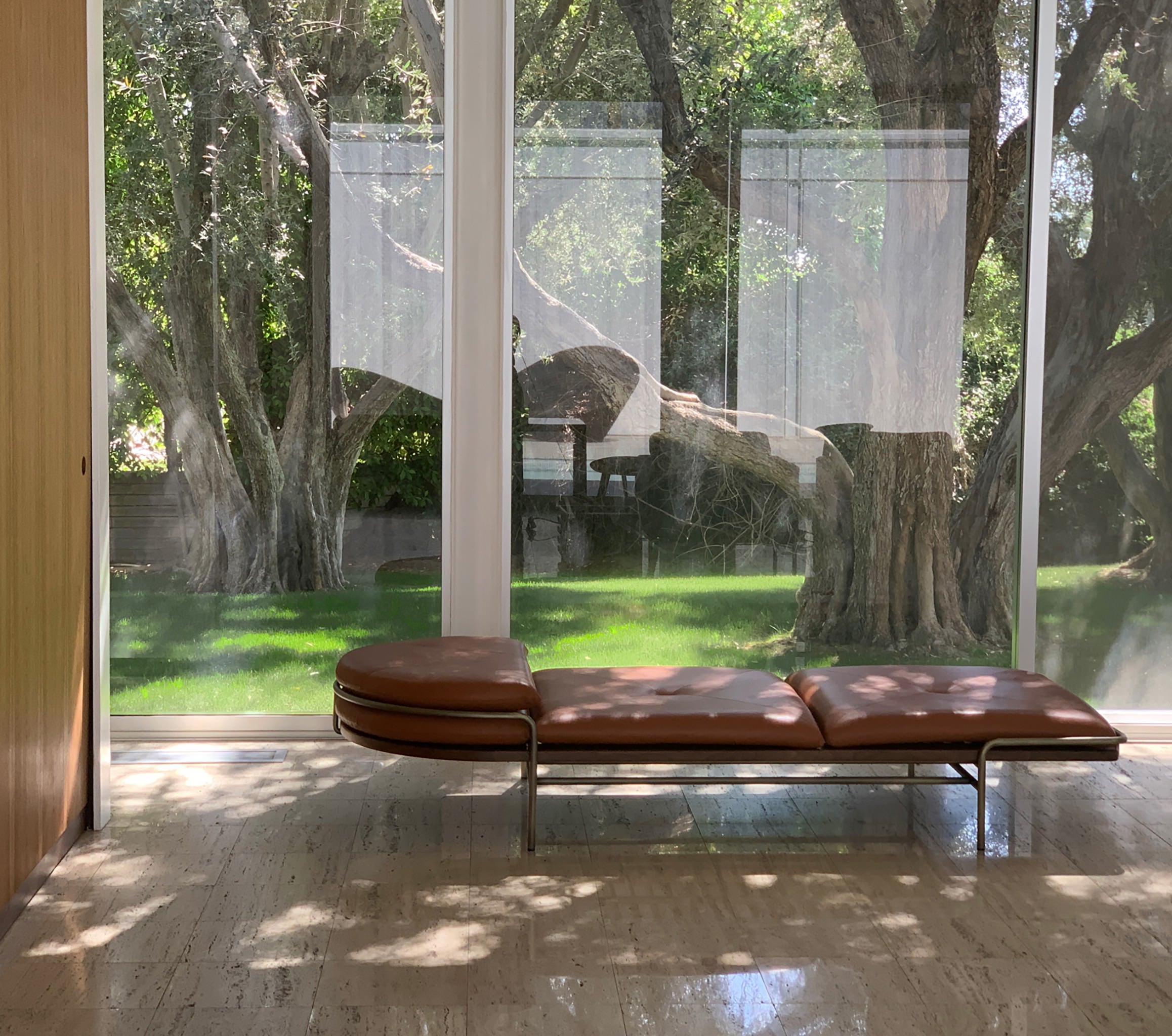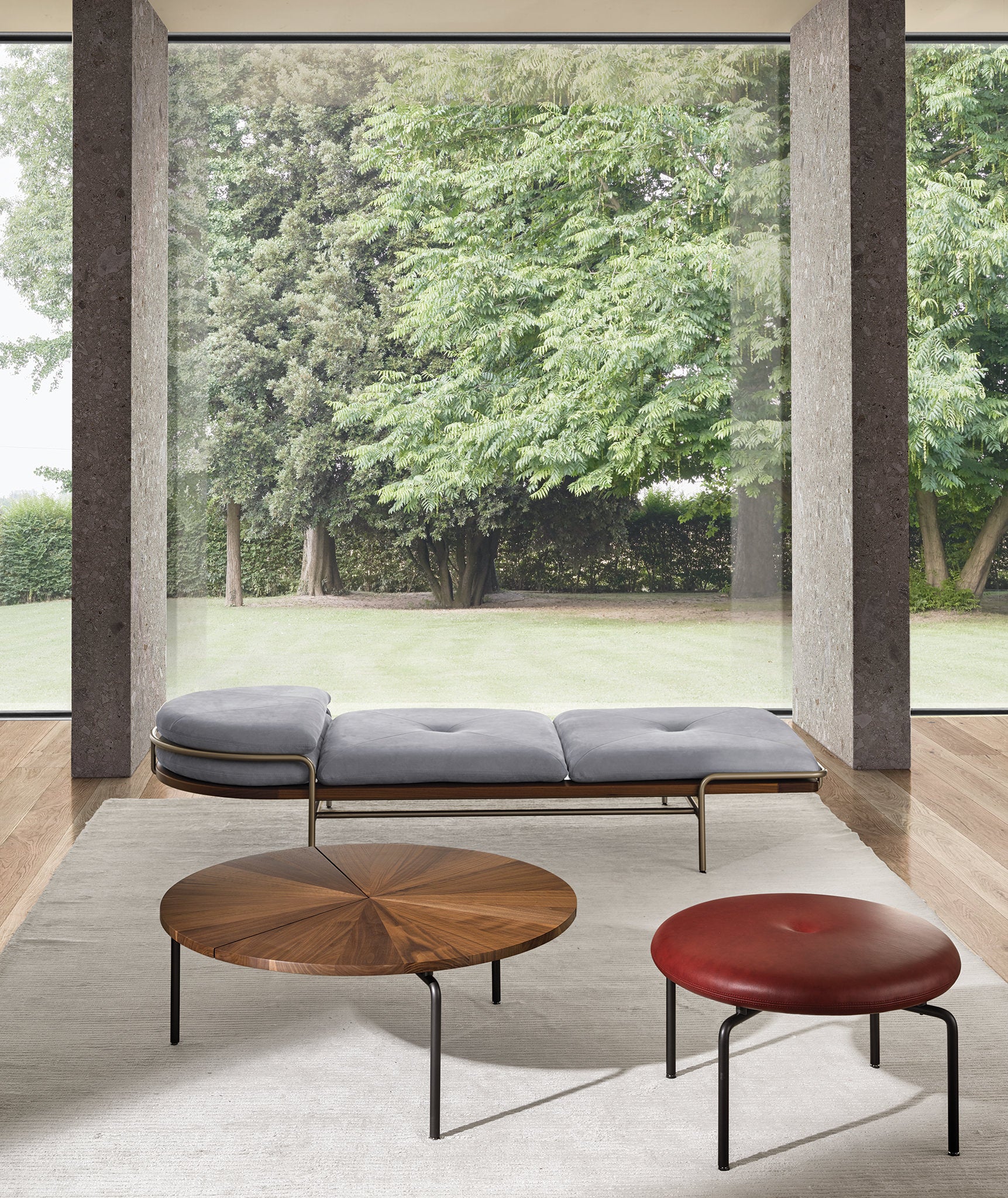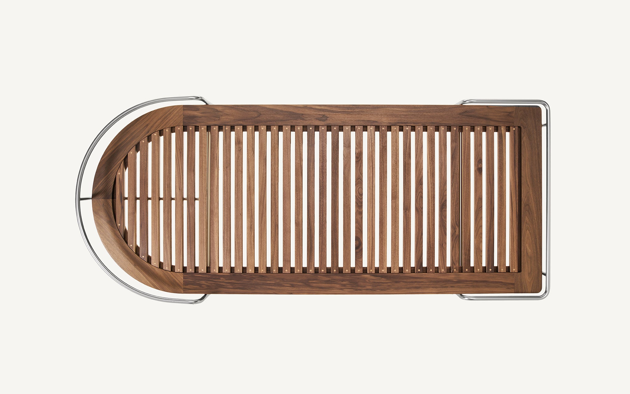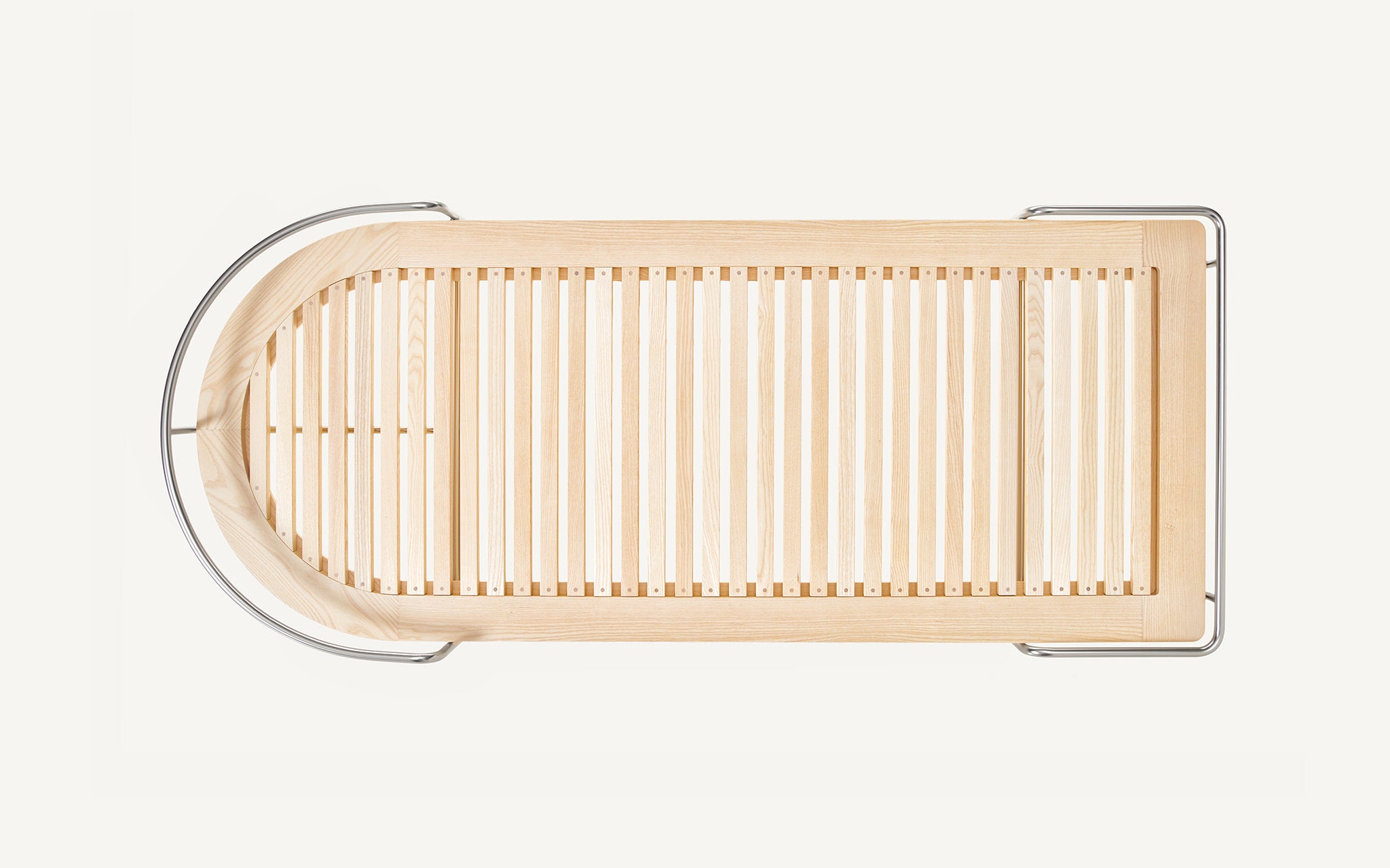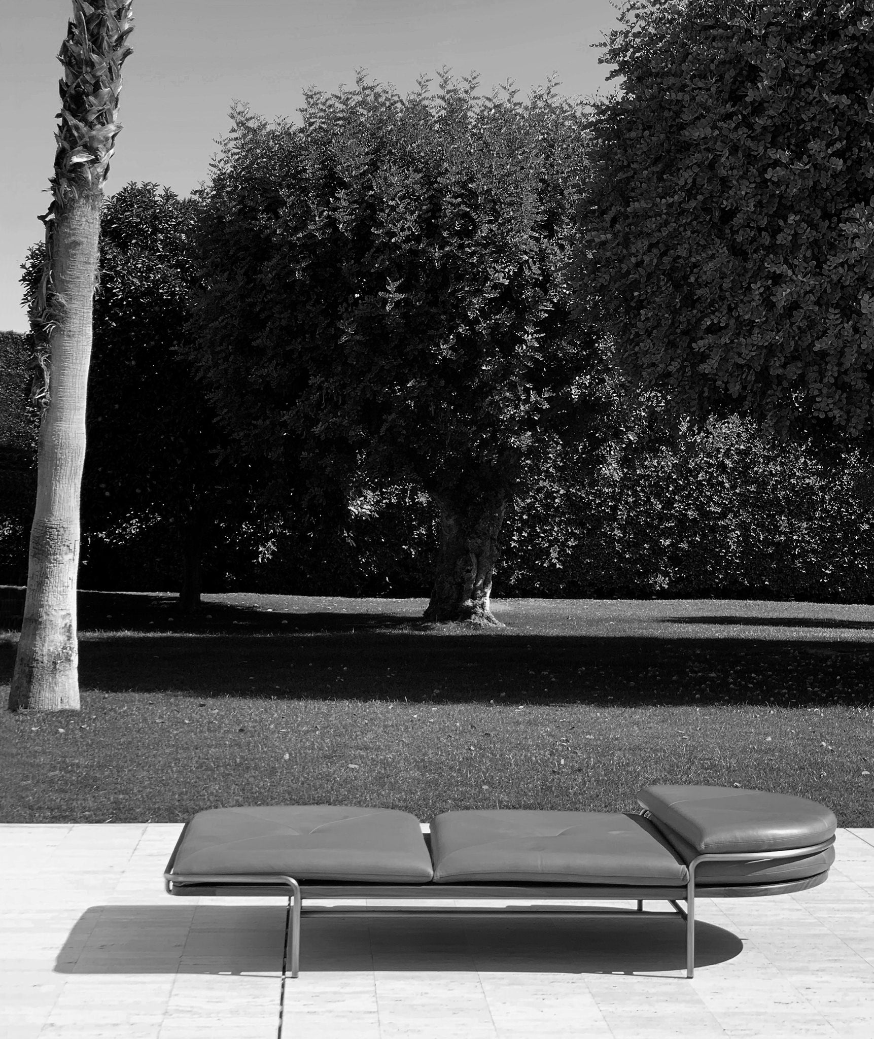 These designs are a celebration of the pure geometry championed by the Wiener Werkstätte and Bauhaus. Simple, graphic, tubular steel creates a set of silhouettes in an unbroken line, suspending the softest of leather upholstered seating panels, backs, and wooden tabletops. Our Geometric Side Chair, Geometric Lounge Chair and Geometric Sofa feature an ergonomically shaped seat carved from solid wood, and a lightweight pellicle skin of Vienna caning. The tubular steel is wrapped with natural leather to conceal all joins and seams. The Geometric Dining Table with a veneer top and solid wood edges is defined by flamboyantly radiating support elements that meet at a central point, wrapped in leather. The Geometric Daybed has a solid wood frame with pegged slats engineered to allow for variable flex, its tubular steel base creating a continuous arc that holds leather cushions made of dual-density foam for comfort and support.