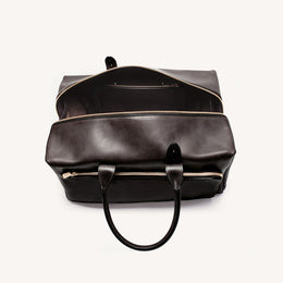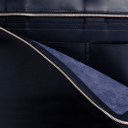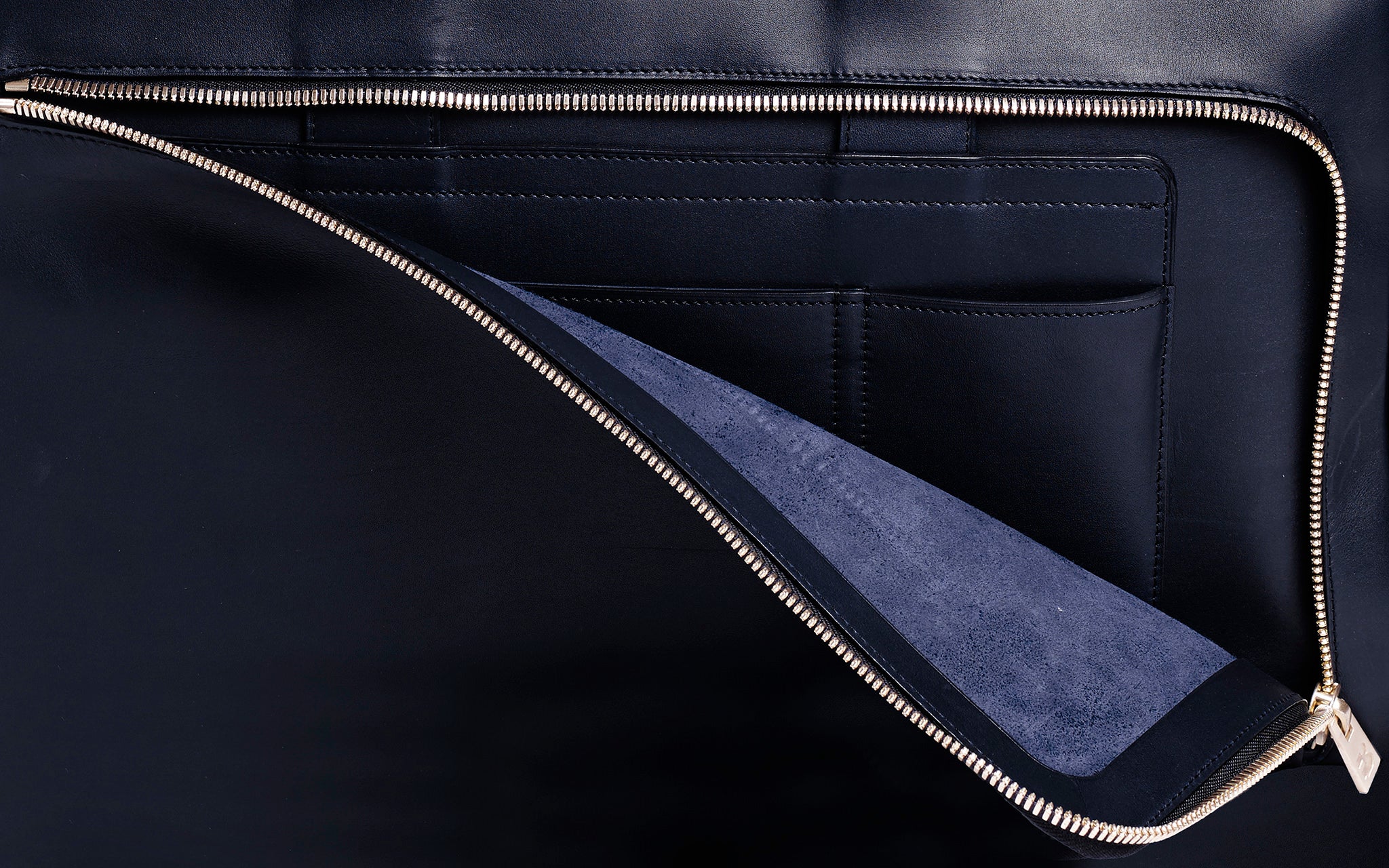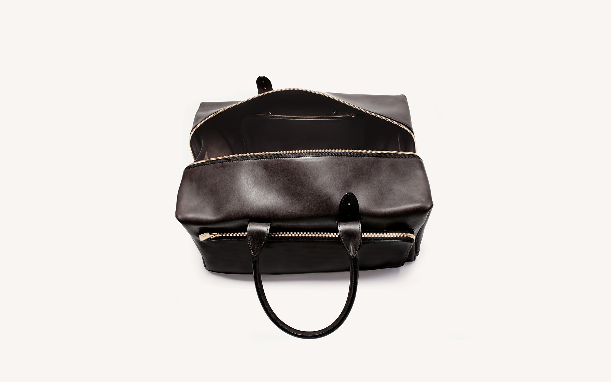 From conception, the bags were designed and constructed with nothing extraneous. All leather goods feature an unlined "nude" construction and an absolute minimum of seams – to reduce weight and to showcase the quality of the leather. Internally, stitches and seams are hand tied and taped, and edges are scored and hand-burnished using a vintage dry harness technique. Like a double-face cashmere coat, the inside of the bag is as beautiful as the outside.