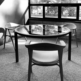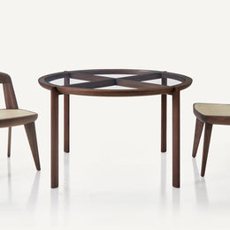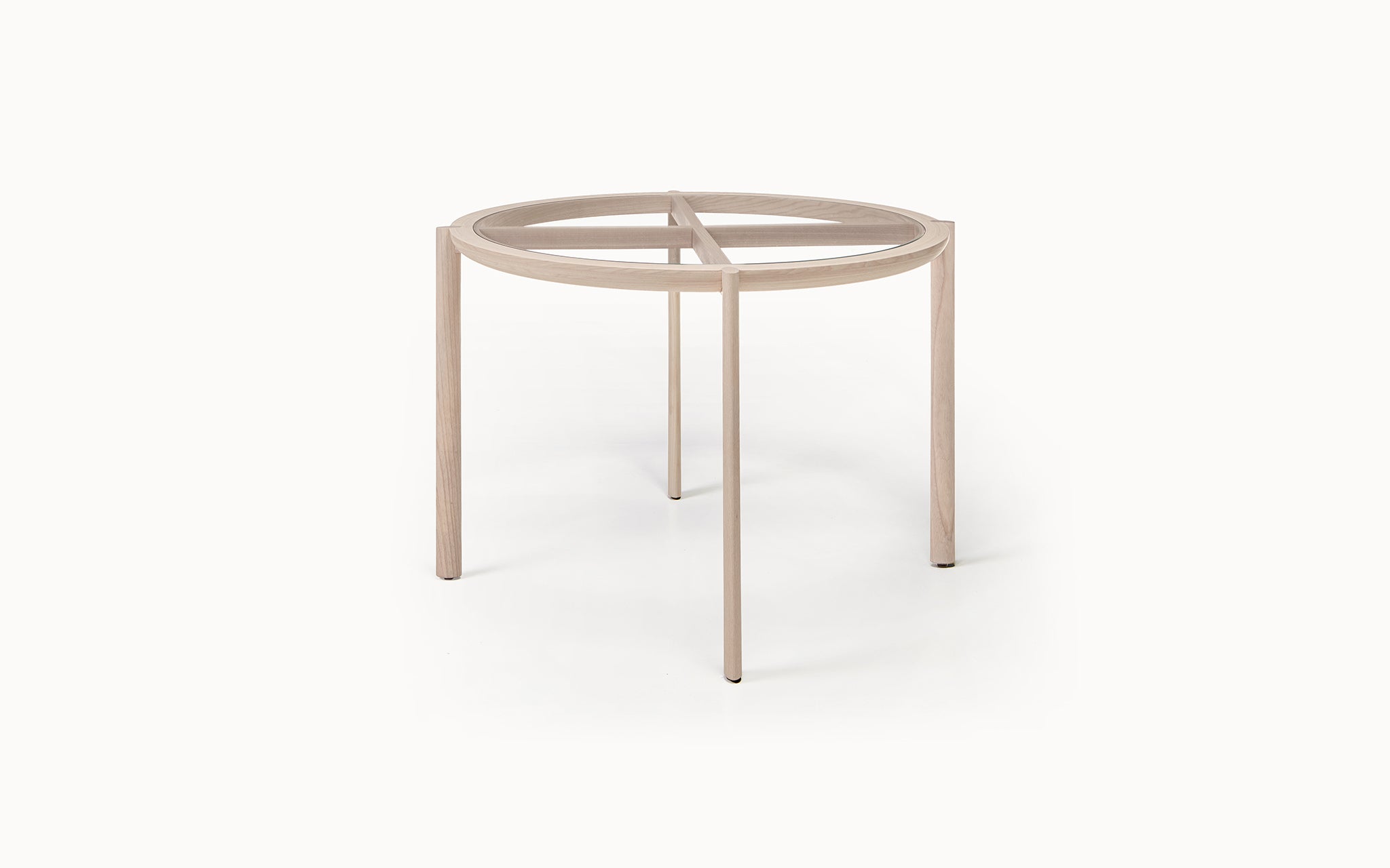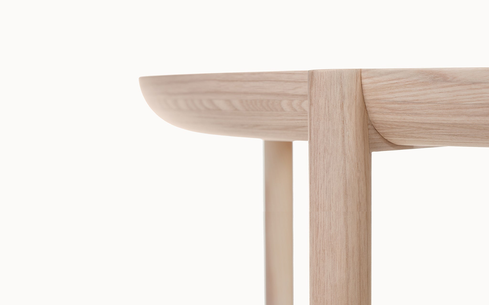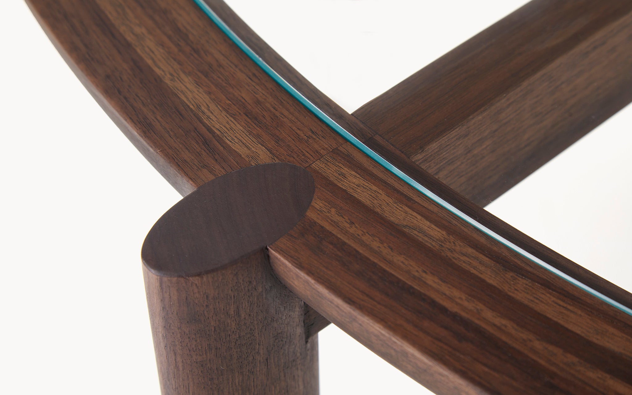 This design was originally commissioned by a large Australian architecture firm who wanted the perfect wooden table to complement other BassamFellows pieces throughout the lobbies of a new tower. As simple as a geometric line drawing, the table features a large wooden ring supported by three or four spokes which connect seamlessly to the outer edges. A precise timber circle – the work of our master craftsmen – emphasizes the wood’s grain, conjuring a concentric effect best admired through a glass top. The table’s elliptical legs create a slim silhouette that balance the top’s bold geometry. With no hard edges, the legs can appear wide or thin, depending on the viewing angle. The Spoke Table balances heft and levity, an elegant and versatile design that marries architectural precision with craftsmanship.