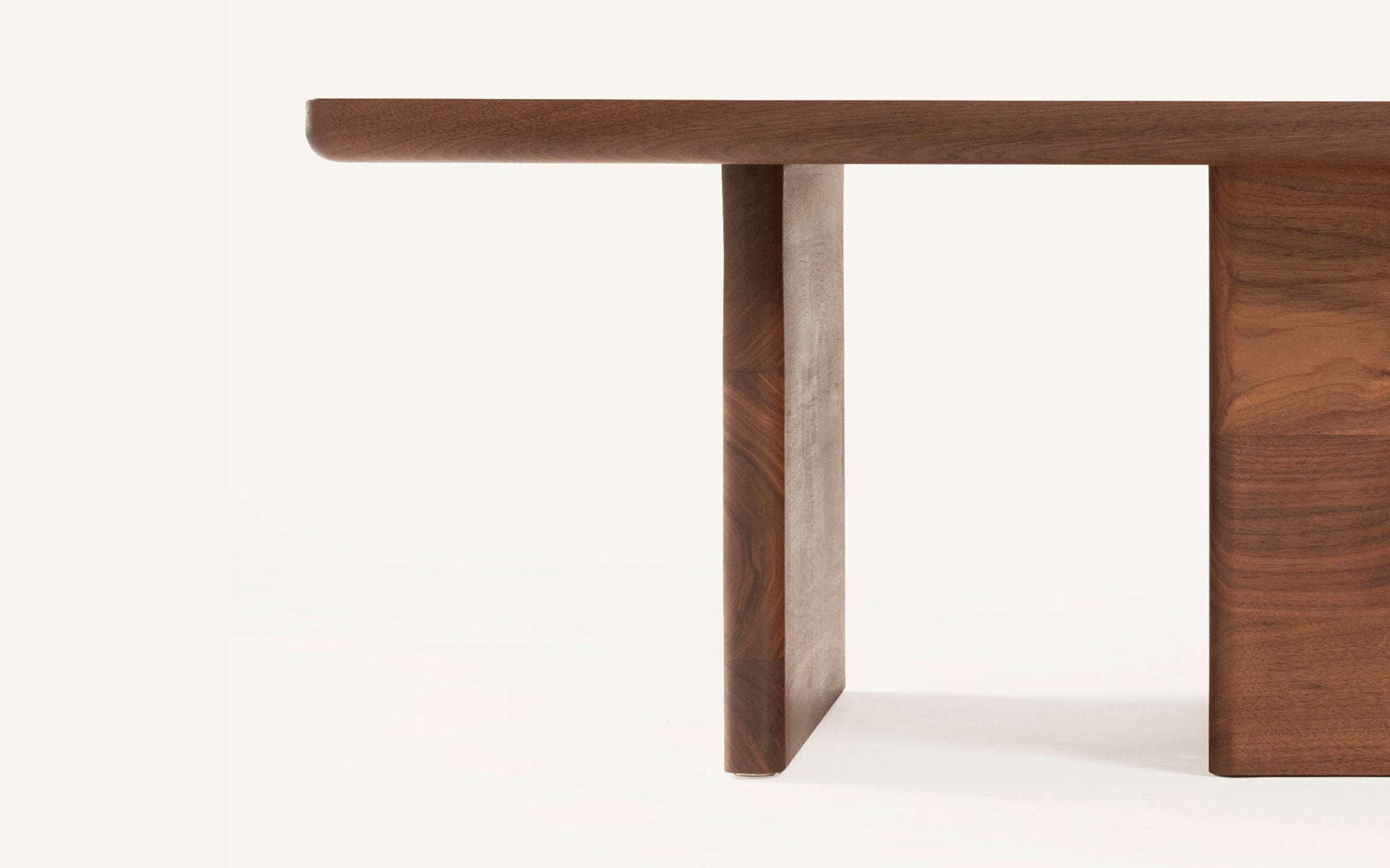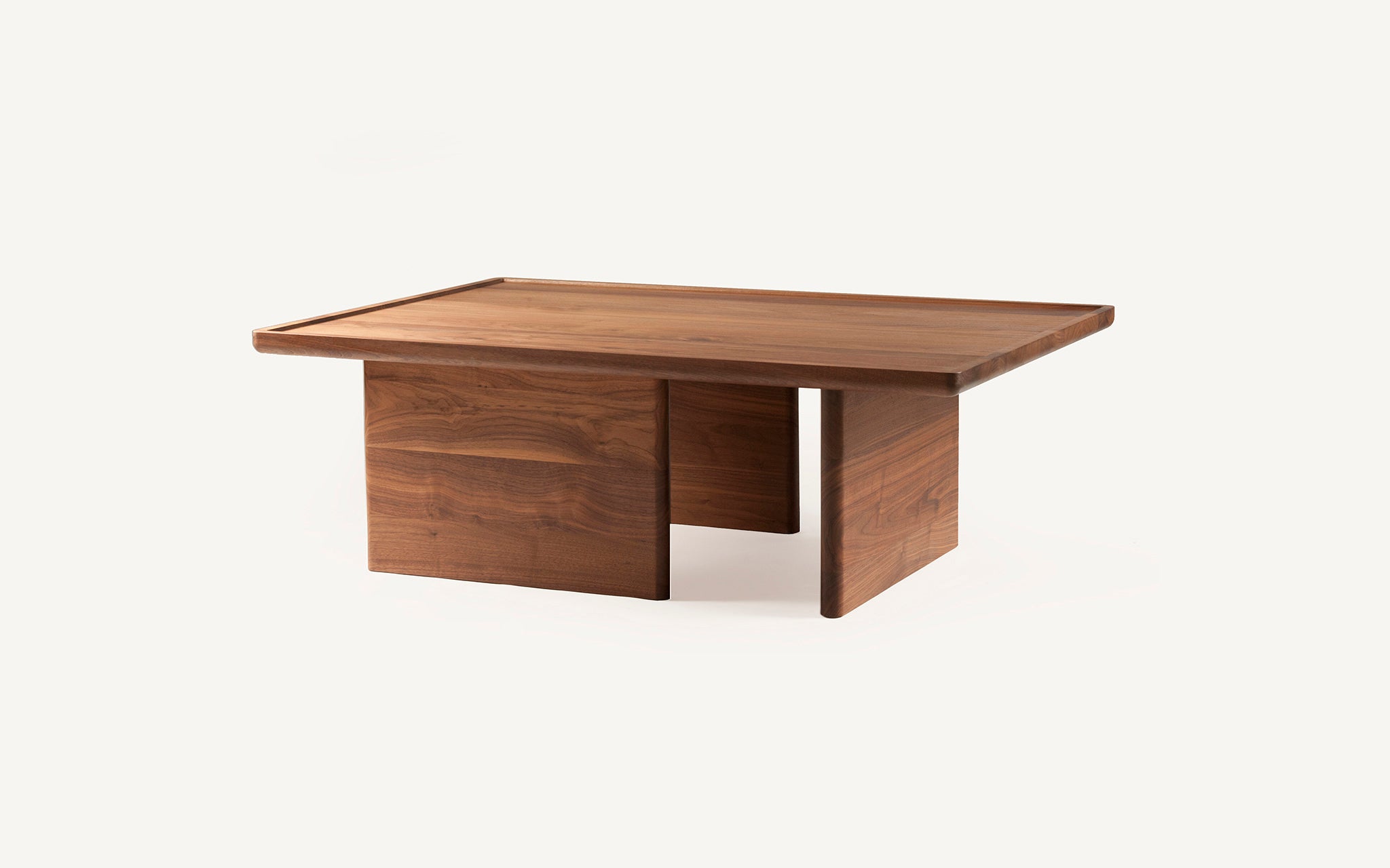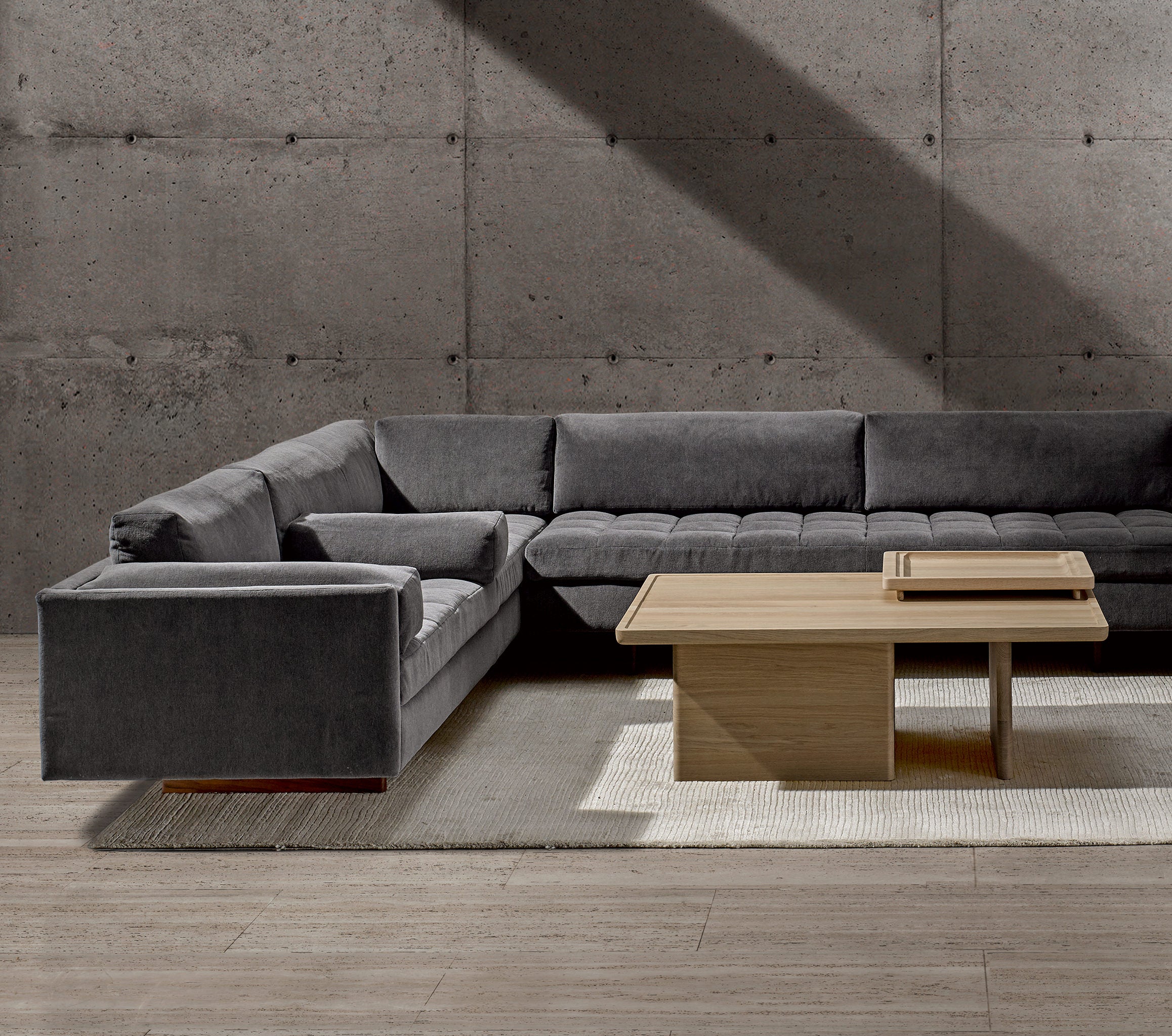 In silhouette, the sofa accentuates the horizontal, with one large cushion for the seat and super thin arm panels that hold wide, comfortable arm cushions which double as head pillows when reclining. The Asymmetric offers a supremely comfortable sit, incorporating a feather and down topper layer together with three layers of foam in varying densities, including the gel foam found in high quality mattresses. The seat is comprised of individually quilted, eight inch square mini pillows that are stitched together to form the long cushion. The Asymmetric Table Collection expands the planning options, with three table sizes designed to work with the sofa modules. These can be used as end tables, to turn a corner between sofa sections, or simply on their own. Each top is carved from solid wood with a subtle edge detail borrowed from our Tray tables.
