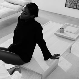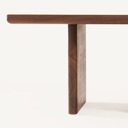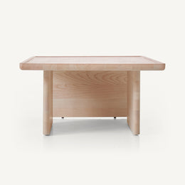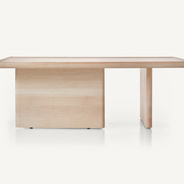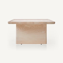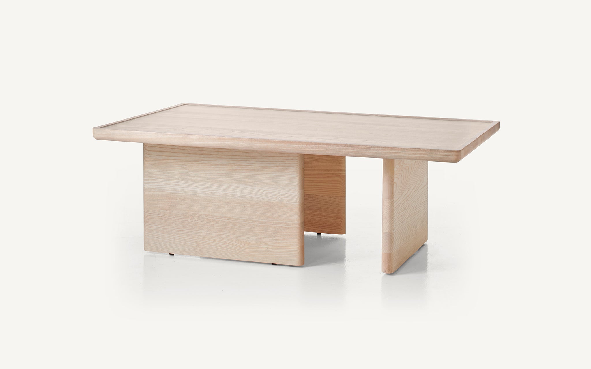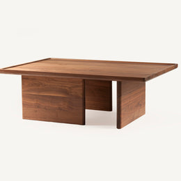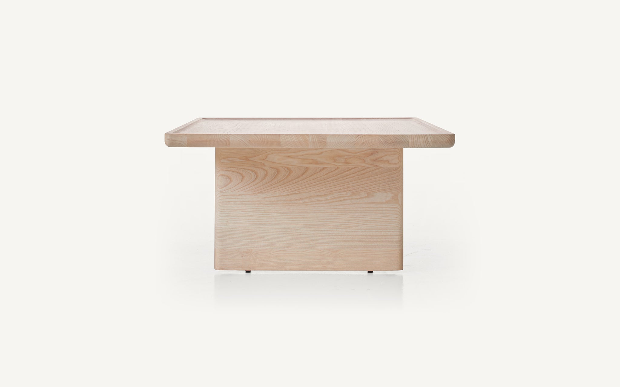 In silhouette, the sofa accentuates the horizontal, with one large cushion for the seat and super thin arm panels that hold wide, comfortable arm cushions which double as head pillows when reclining. The Asymmetric offers a supremely comfortable sit, incorporating a feather and down topper layer together with three layers of foam in varying densities, including the gel foam found in high quality mattresses. The seat is comprised of individually quilted, eight inch square mini pillows that are stitched together to form the long cushion. The Asymmetric Table Collection expands the planning options, with three table sizes designed to work with the sofa modules. These can be used as end tables, to turn a corner between sofa sections, or simply on their own. Each top is carved from solid wood with a subtle edge detail borrowed from our Tray tables.