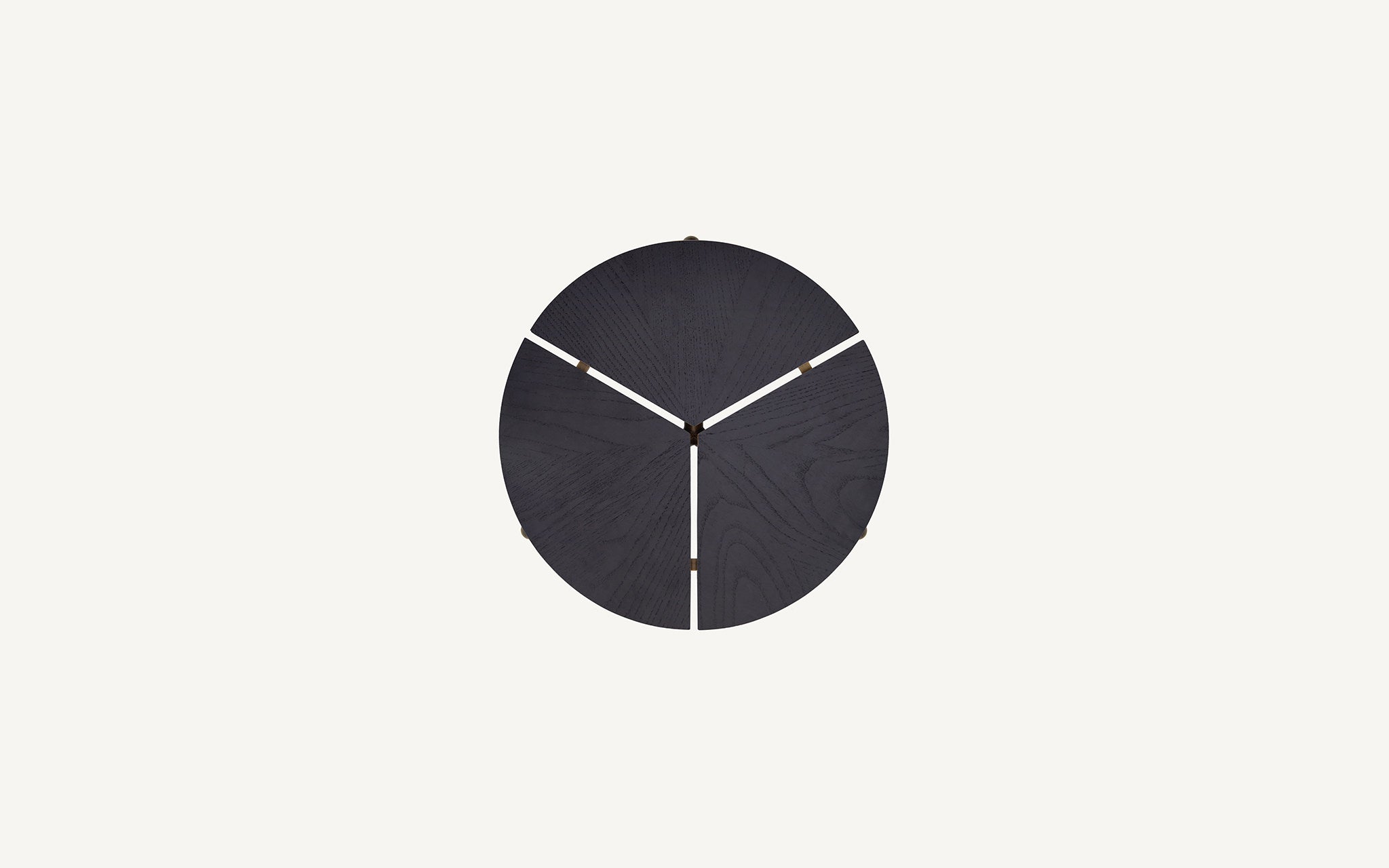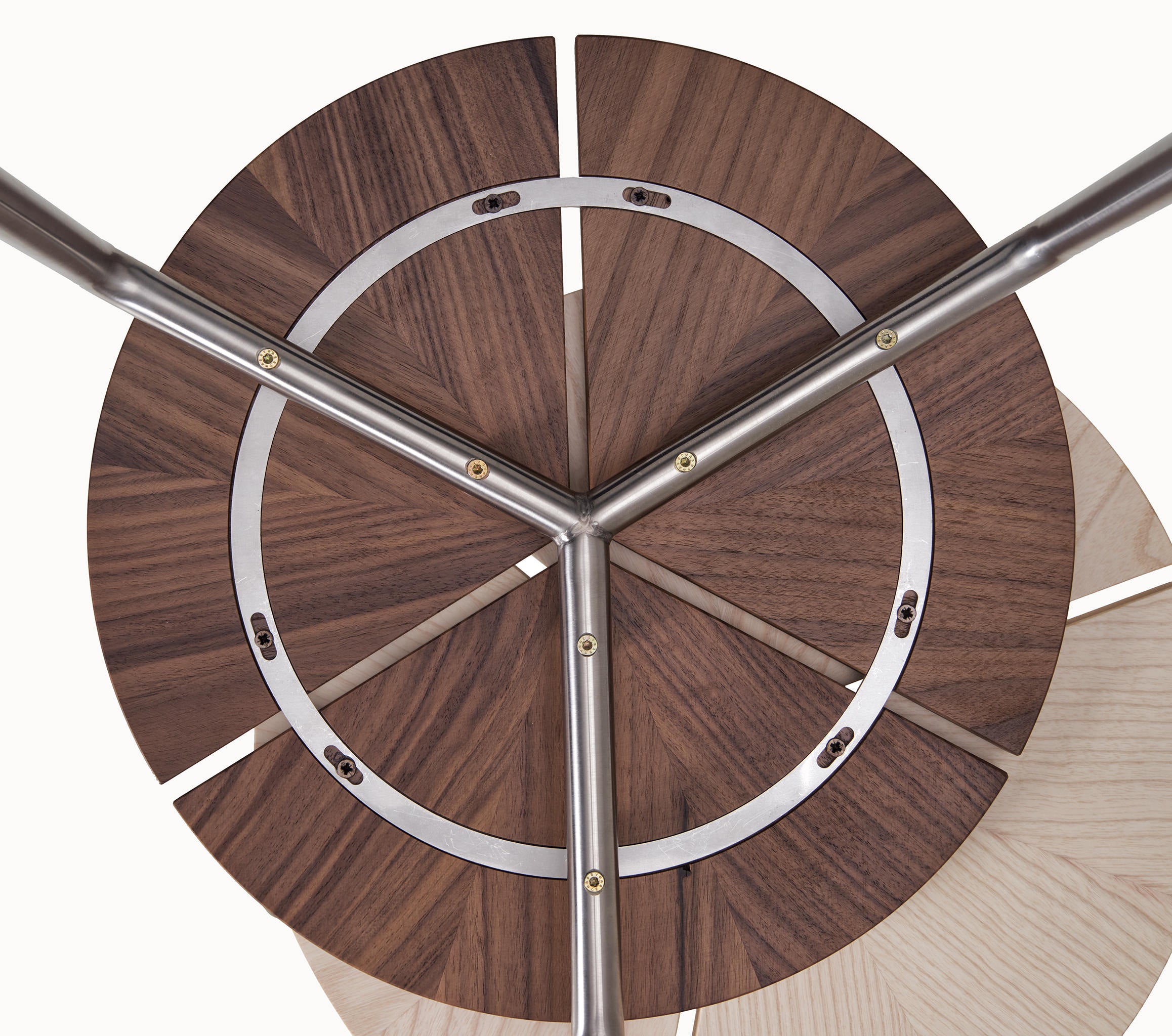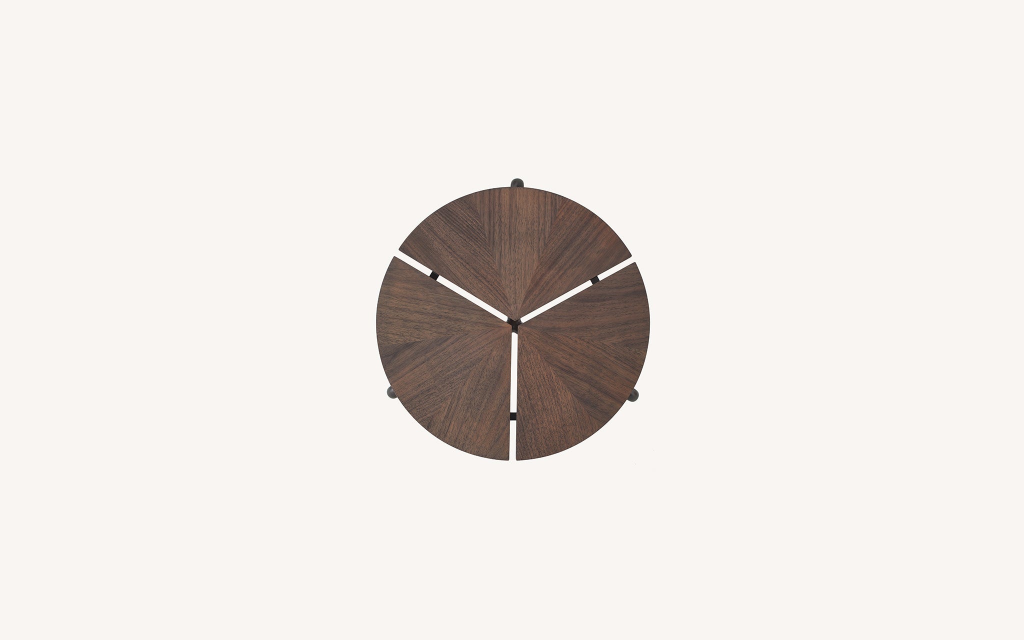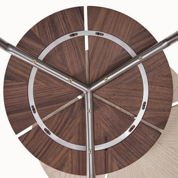The surface incorporates a strong geometric identity. When viewed from above, here is a perfect circle divided equally into wedge shapes, the grain of its wood radiating from the center. The tabletop is cut into three equal segments separated by a reveal, which allows the pie-shaped solid wood wedges to move freely with variations in humidity, eliminating warping and splitting.