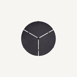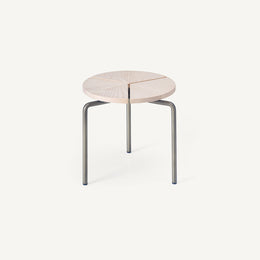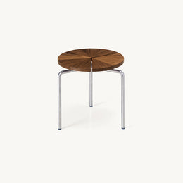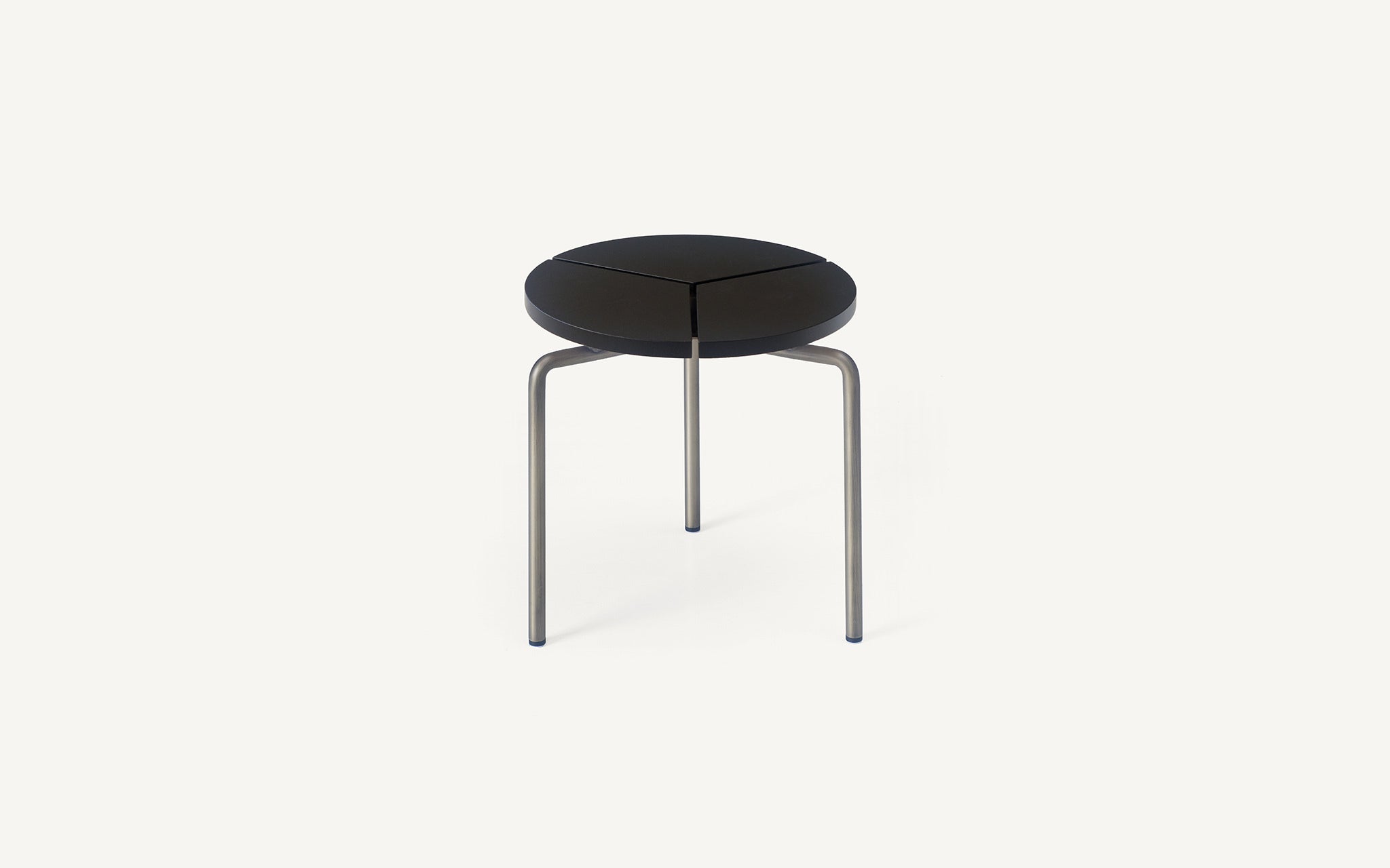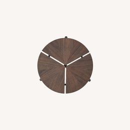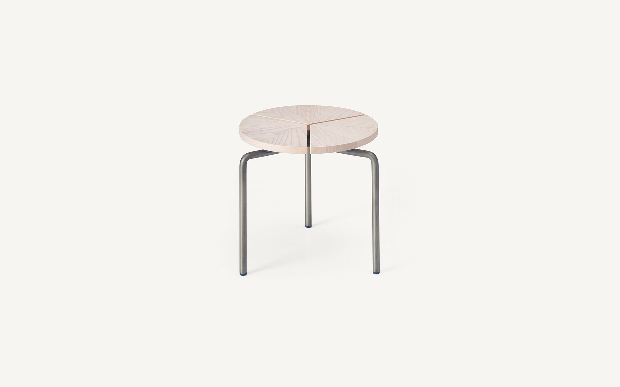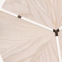 The surface incorporates a strong geometric identity. When viewed from above, here is a perfect circle divided equally into wedge shapes, the grain of its wood radiating from the center. The tabletop is cut into three equal segments separated by a reveal, which allows the pie-shaped solid wood wedges to move freely with variations in humidity, eliminating warping and splitting.