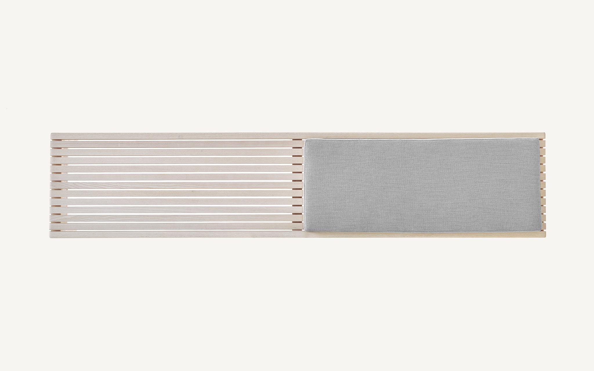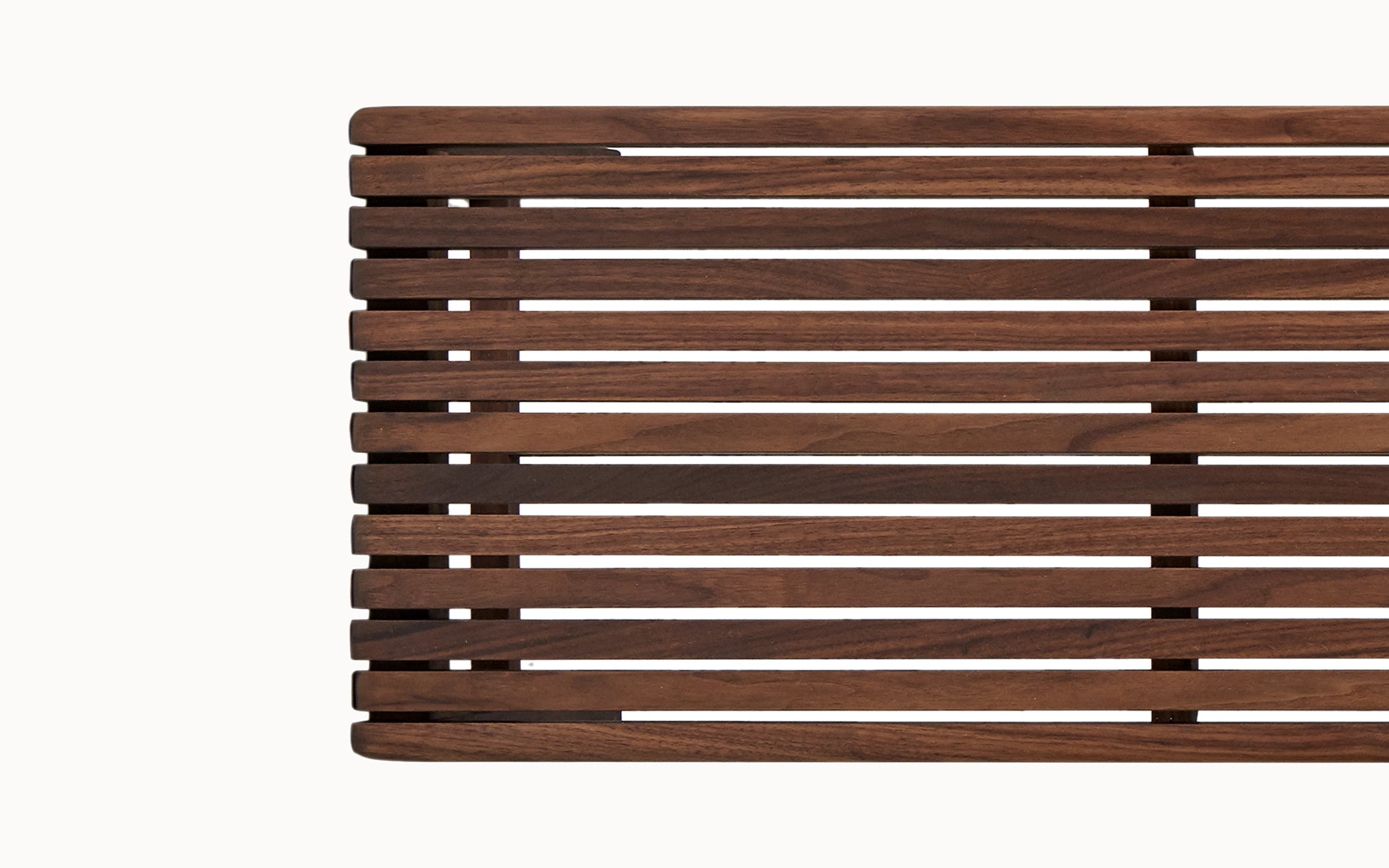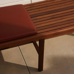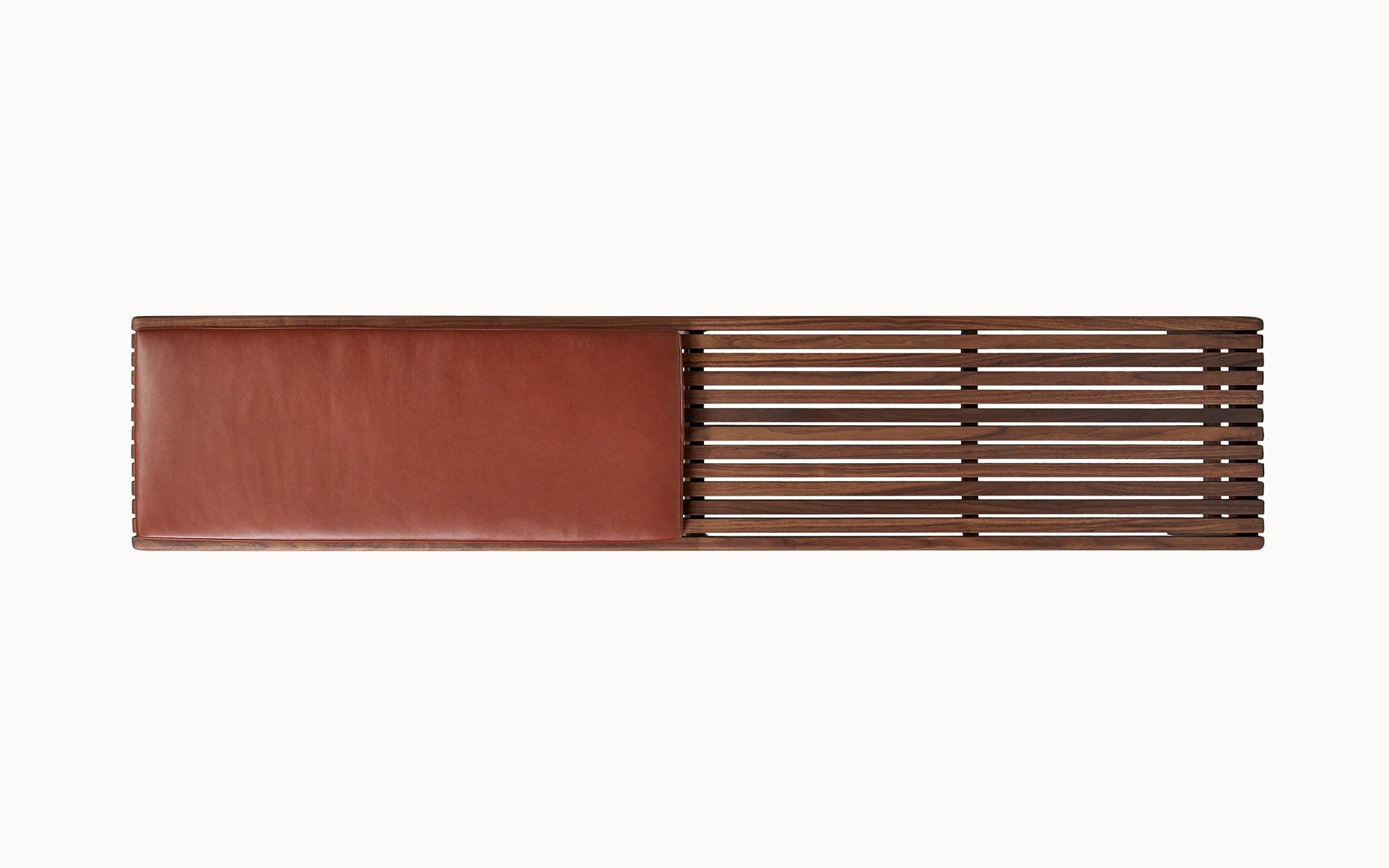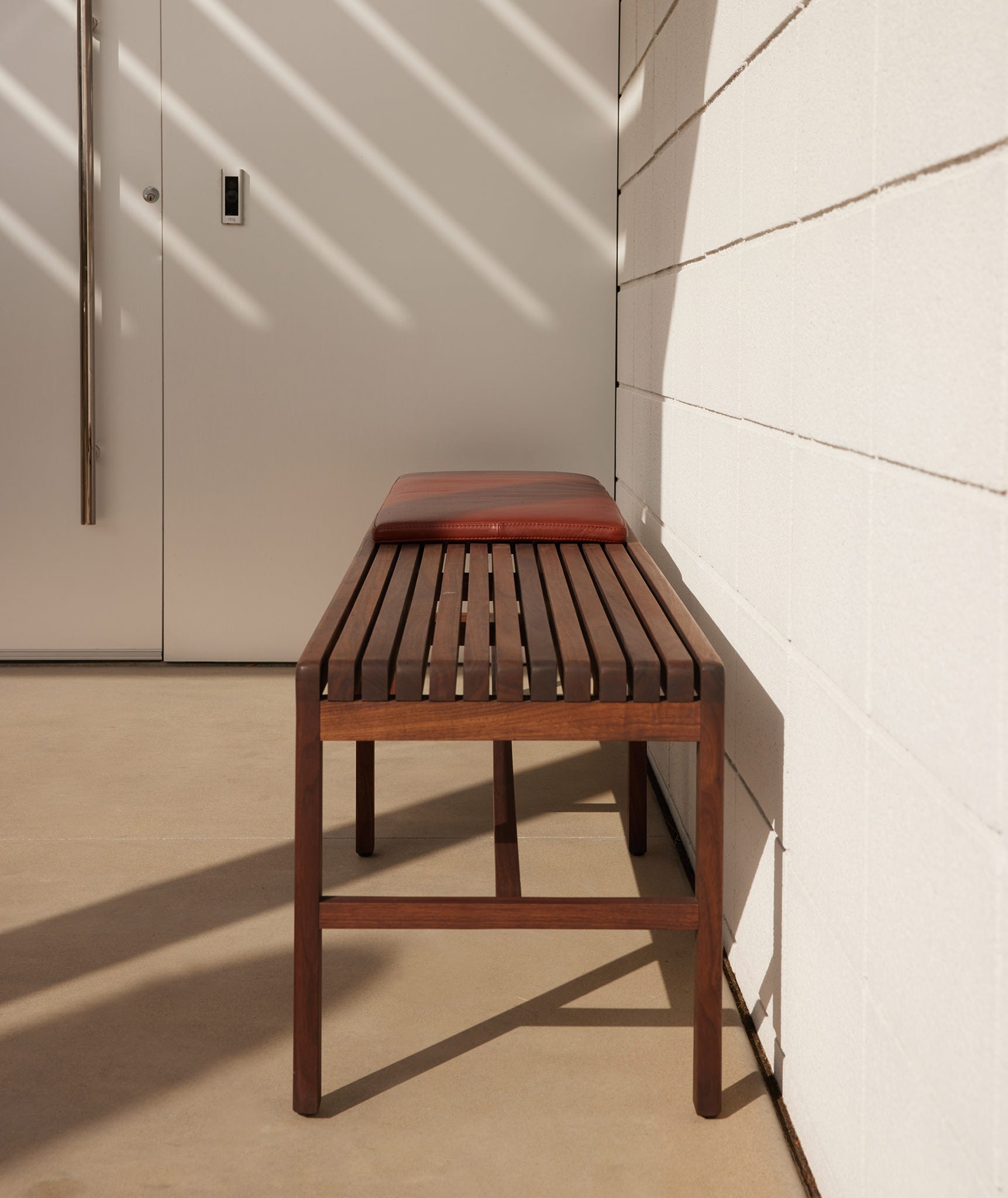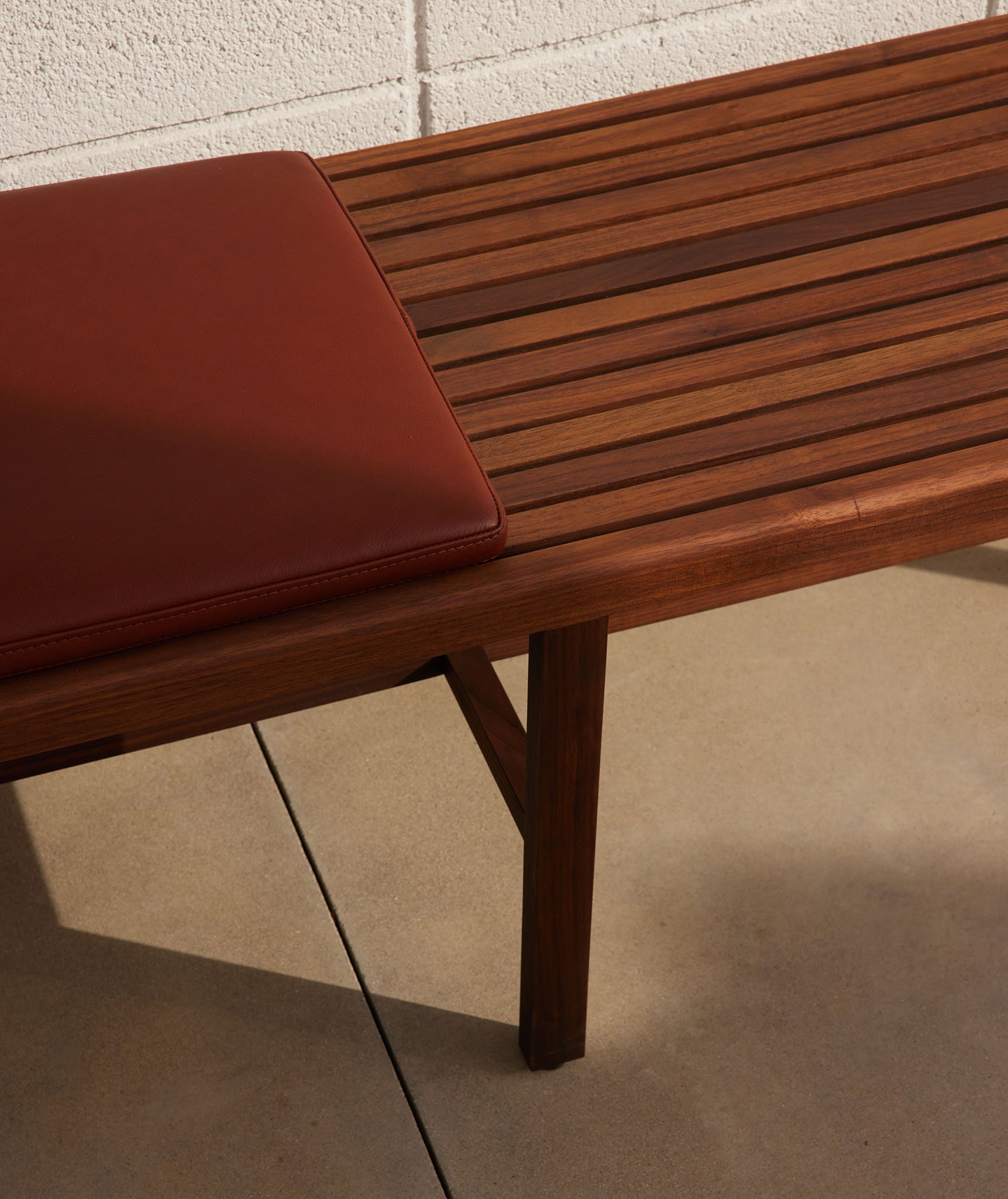 Our version of this core essential is slender and soft in tone, but with an obvious engineered strength. Originally designed for a luxury hotel group, it was conceived to meet the needs of a variety of environments, from private homes to constant use in commercial spaces. The Slat Bench is a solid wood study in crafted simplicity and structural honesty. The beams of the design form continuous lines, legs meld seamlessly into parallel slats spanning the bench’s generous length. The resulting effect is one of both heft and surprising lightness. The BassamFellows Slat Bench is available with or without cushioning, in two different sizes.