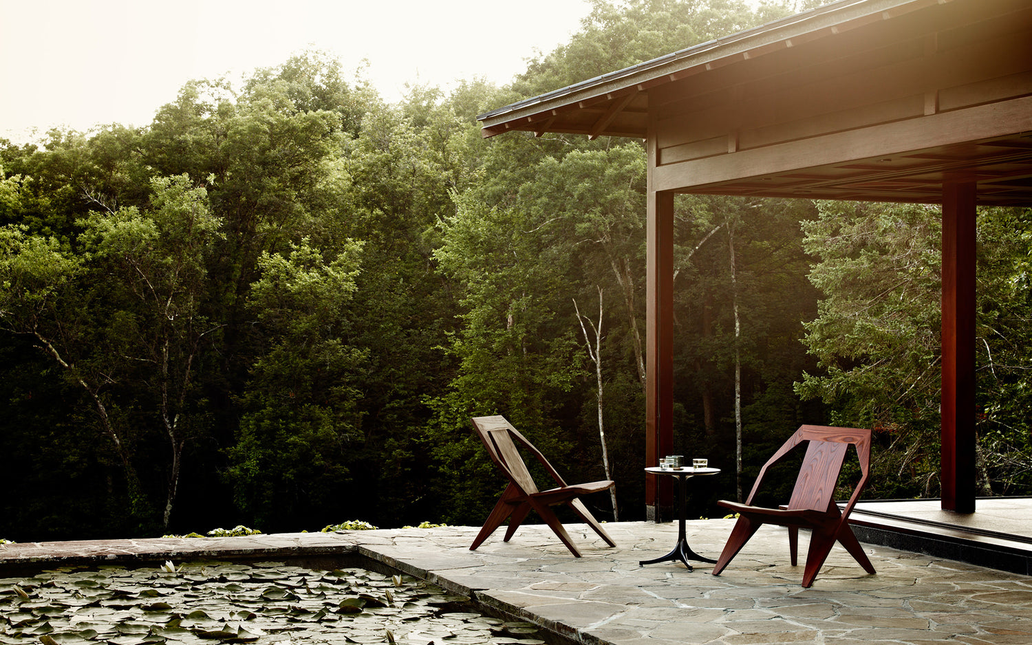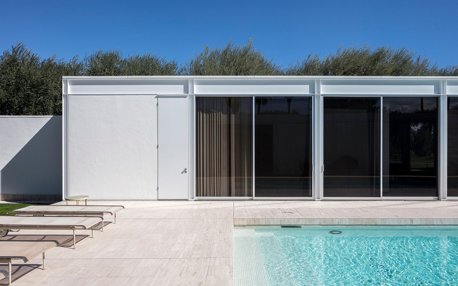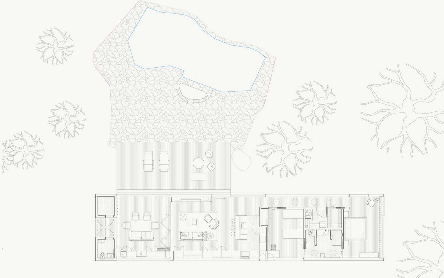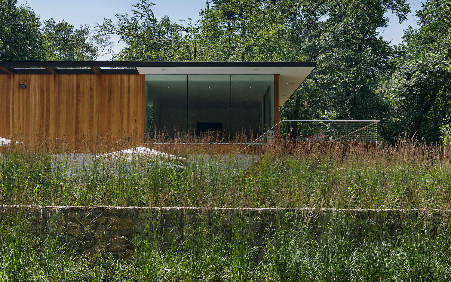 The current owners of the Willis Mills house asked us to continue the evolution of the house years after our initial restoration. The brief was to create a separate pool house/guest pavilion to engage the existing pool and take advantage of stunning views across the ridge while complementing the form and materiality of the original house.